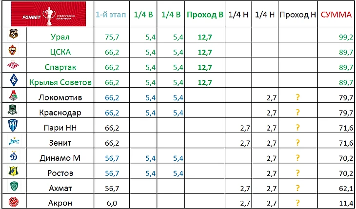 Вторые матчи (а кому и первые) 1/4 Пути регионов еще не сыграны, есть только восемь участников, зато прописанный гонорар известен, поэтому он учтен в таблице. Кто-то четверо из них получит дополнительный профит в 5,38 миллионов, тогда эта таблица примет окончательно-промежуточный вид.