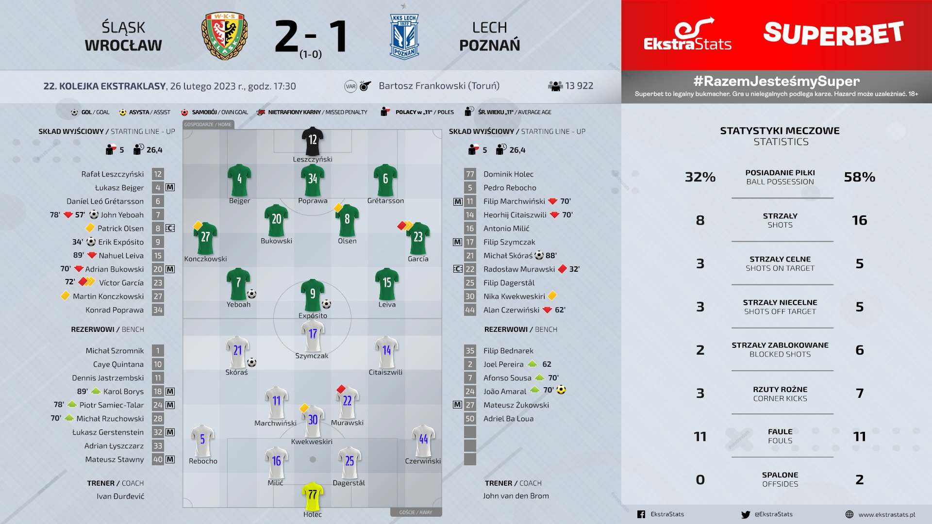«Лех», вышедший в 1/8 лигу конференций, отправился на выезд во Вроцлав к «Шлёнску». Джон ван ден Бром предоставил отдых некоторым своим лидерам, из-за перебора карточек не попал даже в заявку Ишак, дебютировал в воротах познаньцев Холец. Несмотря на не самый основной состав, познаньцы владели инициативой. В середине тайма Шимчак был близок к тому, чтобы открыть счет, но его удар успели заблокировать защитники хозяев, а на 29-ой минуте произошел ключевой эпизод в игре. Йебоа убежал в контратаку, которую лишь с помощью фола остановил Муравски. Арбитр первоначально показал полузащитнику «Леха» желтую карточку, но после длительного просмотра повторов отменил свое решение, удалив Муравского.