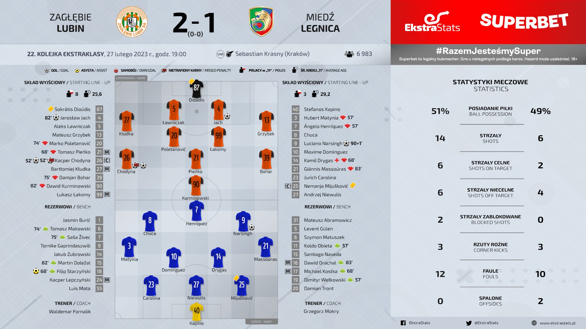 Справился греческий голкипер легничан даже с ударом с одиннадцатиметровой отметки в исполнении Ходыни после падения в штрафной гостей Курминовского. Однако сам Ходыня успел первым на добивание и не оставил шансов Капино. На 57-ой минуте «оранжевые» должны были удваивать преимущество в счете, но Бохар с убойной позиции пробил неточно. На 75-ой минуте любинцы чуть было не пропустили курьезный гол. Диудис ошибся на выходе, столкнувшись со своим партнером, но Лавничак успел вынести мяч с ленточки пустых ворот. Любинцы быстро ответили своей атакой. Курминовски ударом через себя попал в перекладину.