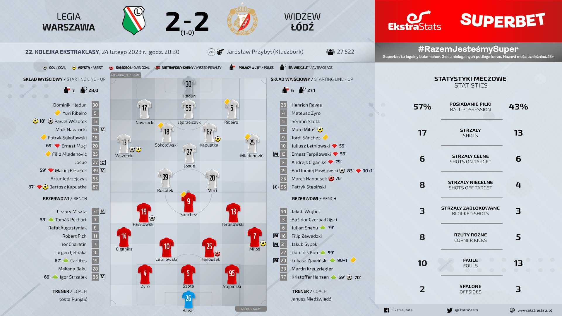 После перерыва инициативой владели «ракувцы». Пытался что-то сообразить у ворот соперника Иви, с хорошей позиции выше перекладины зарядил Гутковскис. Если забить не может атака, на помощь приходит защита. Петрашек пришел в штрафную на розыгрыш аута недалеко от ворот Аломеровича. Гол чешского защитника стал победным и помог «Ракуву» вернуть себе преимущество в девять очков перед «Легией» по результатам 22-го тура.
