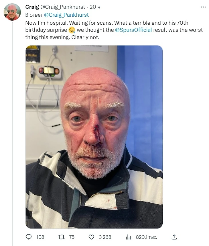 «Сейчас мы в больнице. Ждем снимков. Какой ужасный финал для сюрприза на 70-летие 😪 А мы думали, что результат «Тоттенхэма» будет худшим, что случится этим вечером. Но нет».