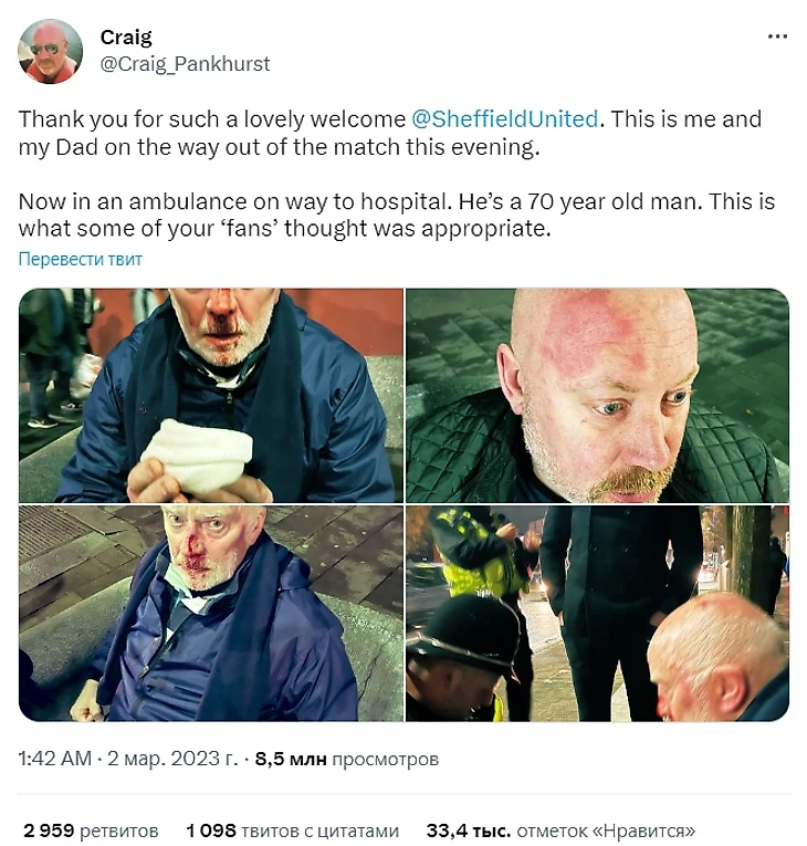 Почти сразу после матча в соцсетях появилась ужасная история, где один из фанатов рассказал, что его 70-летнего отца избили. Нападавшими были болельщики «Шеффилда».