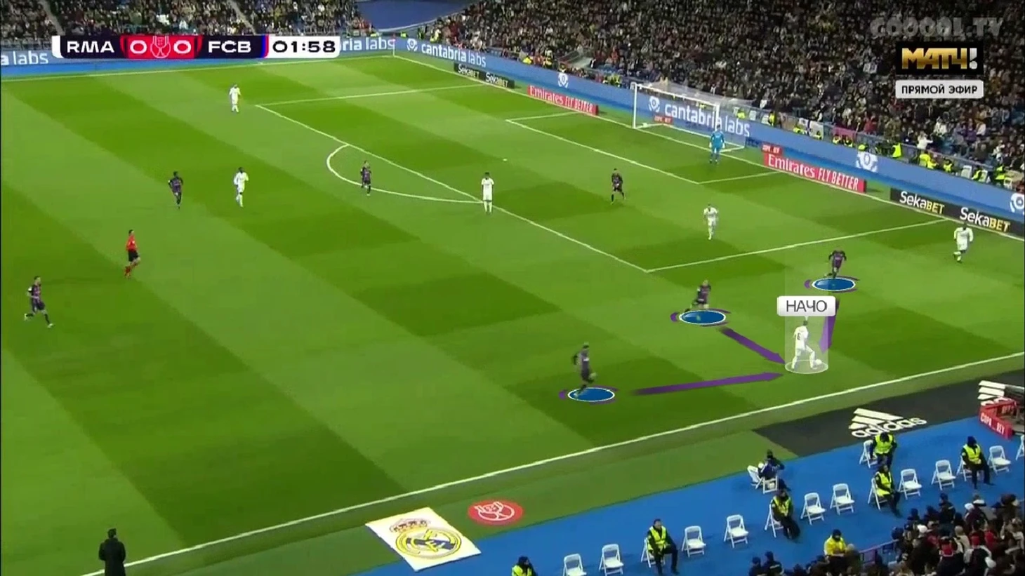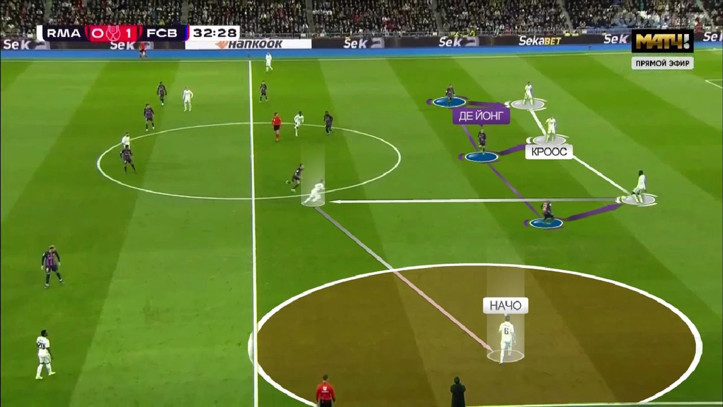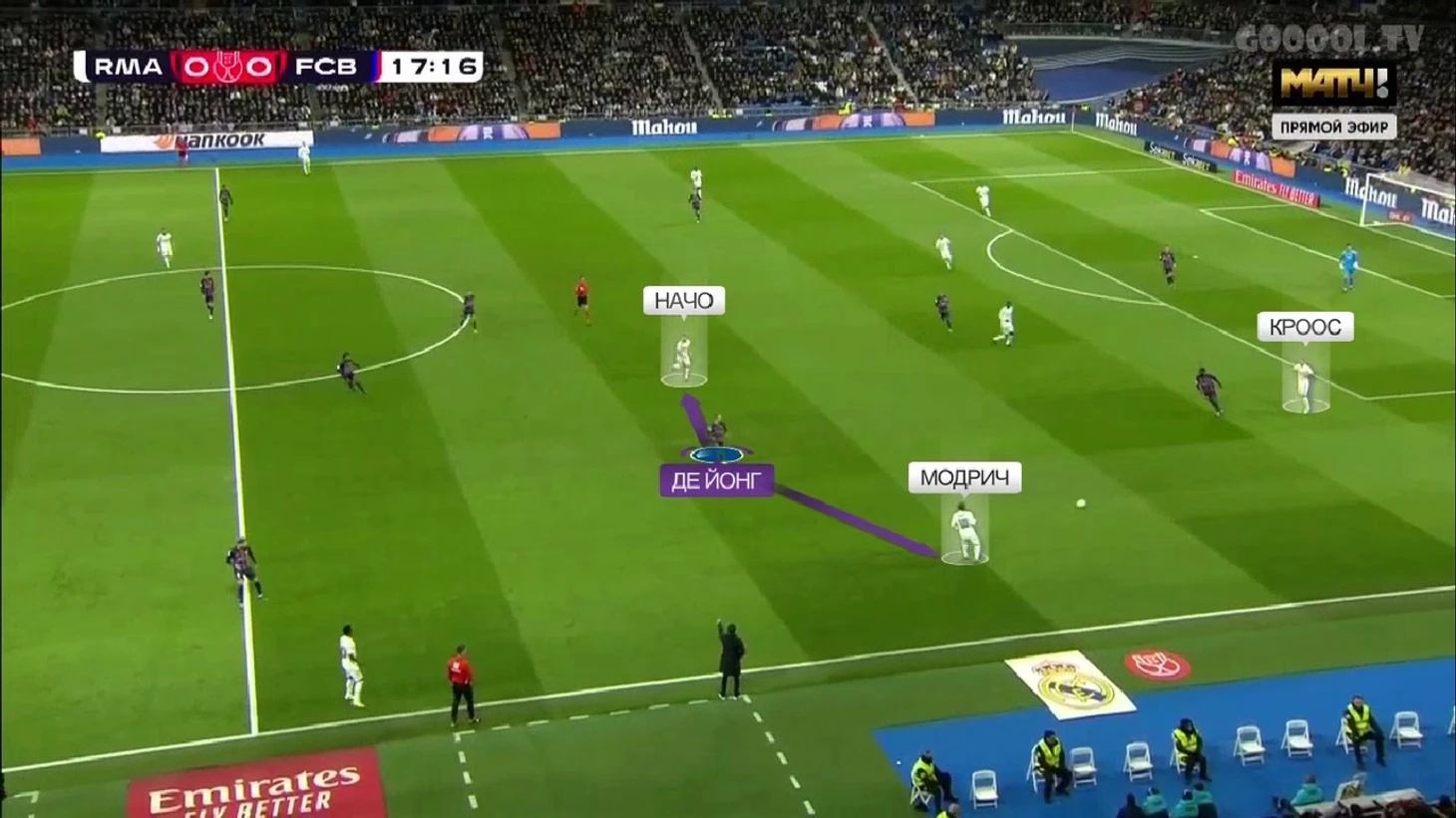 В этой ситуации Кроос снова отошёл в линию к защитникам, вытянул на себя де Йонга, из-за чего в центре поля образовалось больше пространства и от Рюдигера мяч транзитом через Модрича доходит до абсолютно свободного Начо: