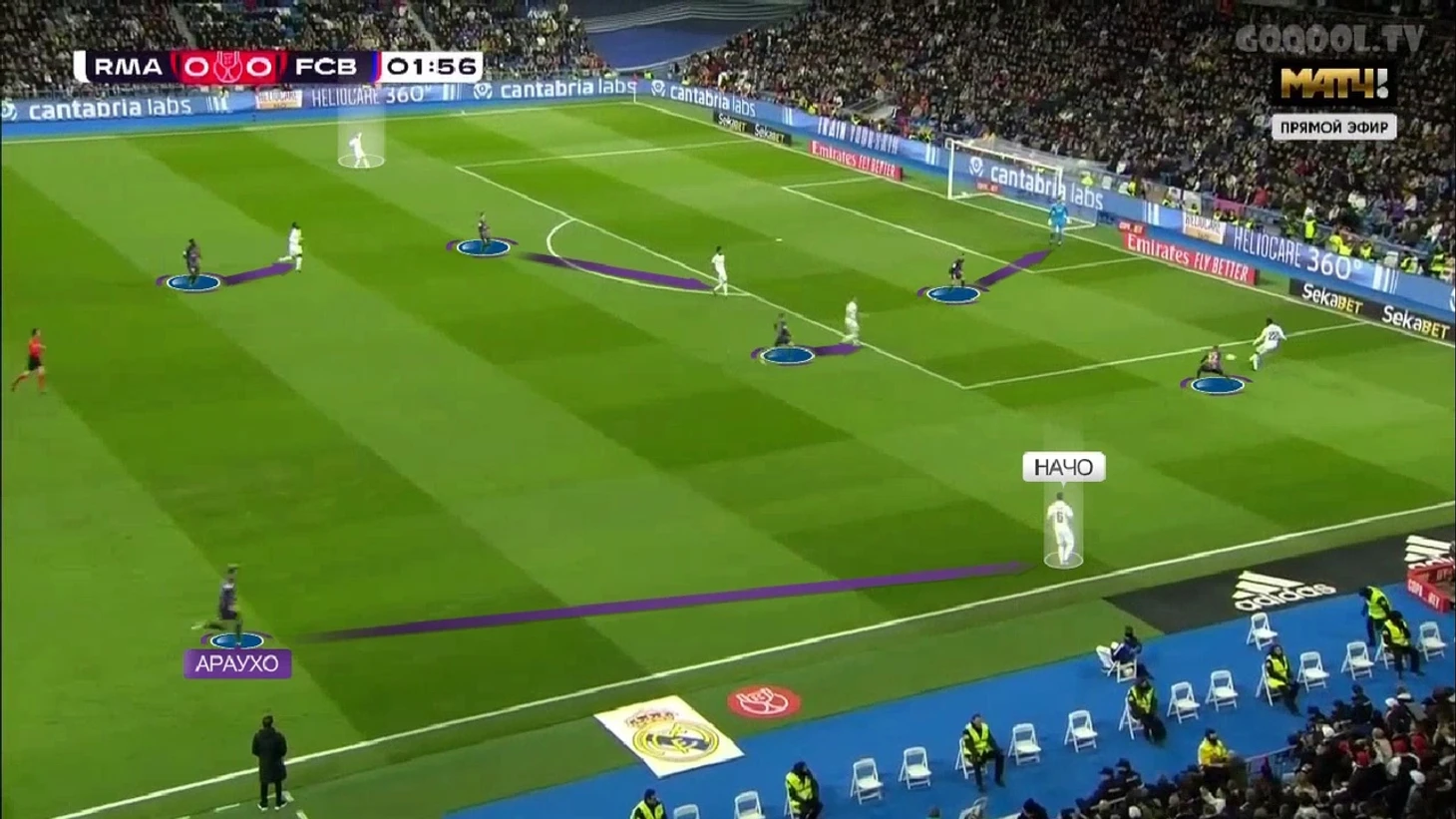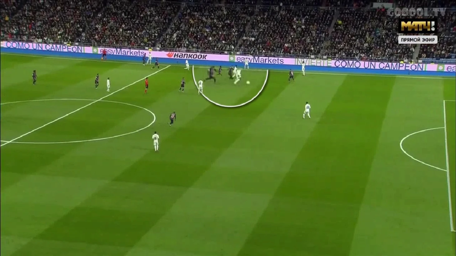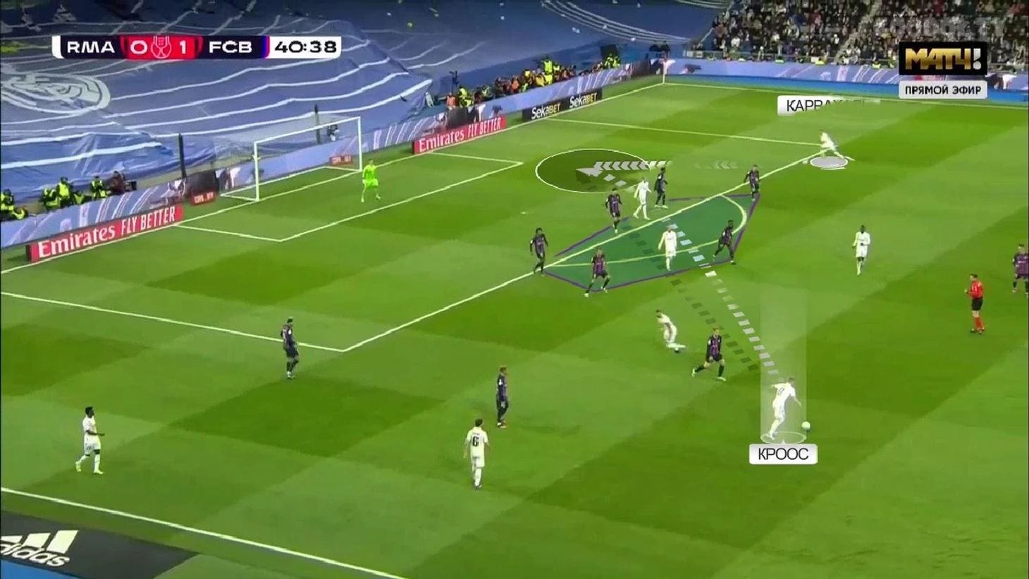 В этой ситуации Кроос снова отошёл в линию к защитникам, вытянул на себя де Йонга, из-за чего в центре поля образовалось больше пространства и от Рюдигера мяч транзитом через Модрича доходит до абсолютно свободного Начо:
