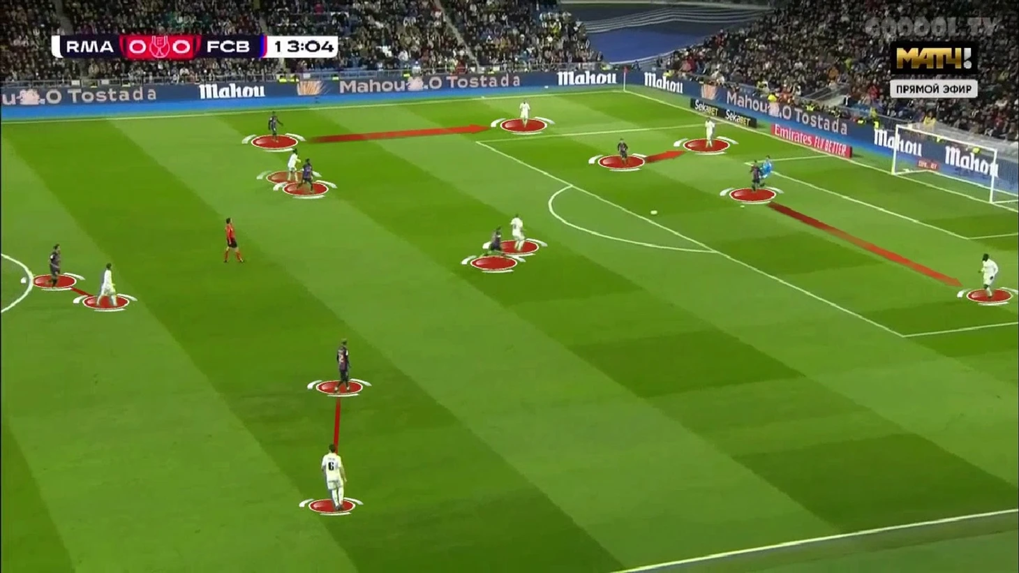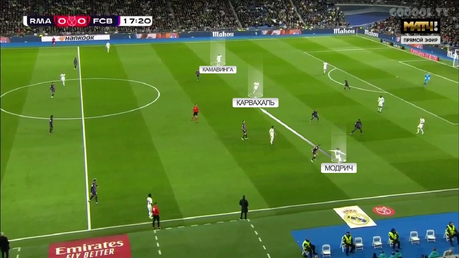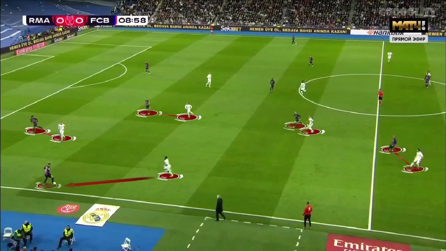 В первую очередь, к такому рисунку игры привёл прессинг «Мадрида». Кажется, что Анчелотти подсмотрел его у «МЮ», который недавно успешно сдерживал «Барселону». По крайней мере, некоторые детали сходятся: например, акцент на центральной части и бо́льшая свобода на флангах: