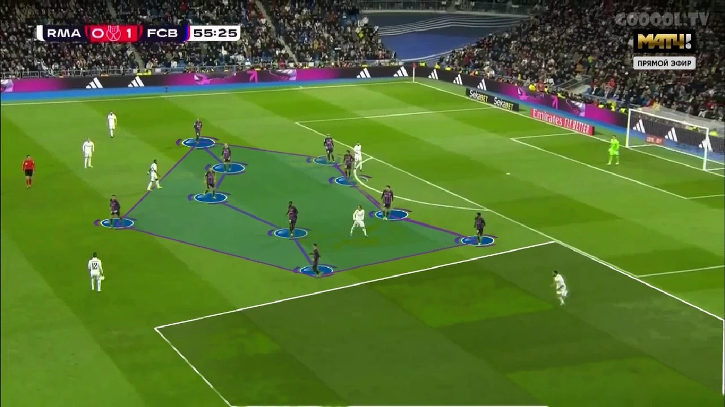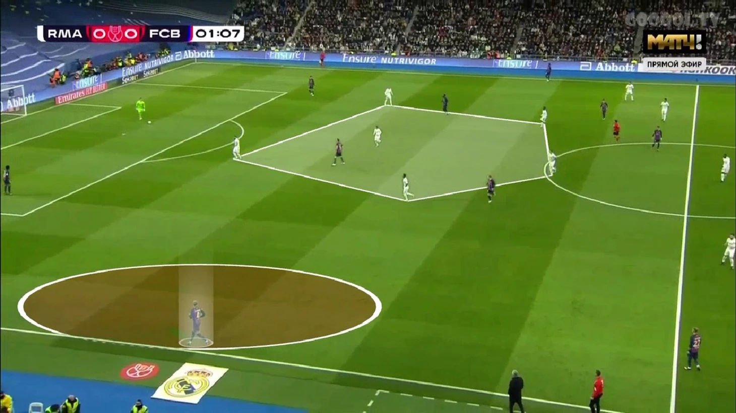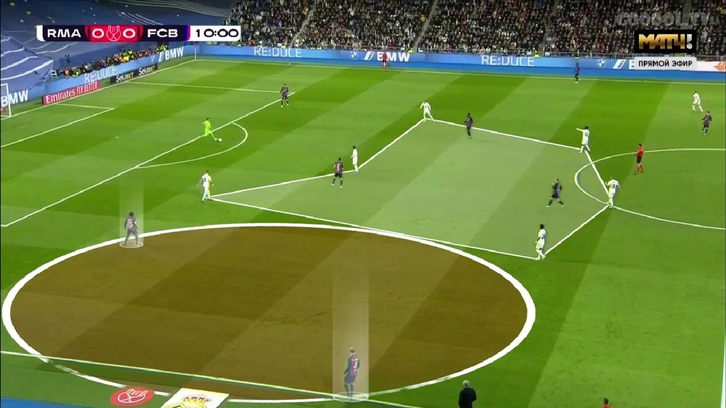 В первую очередь, к такому рисунку игры привёл прессинг «Мадрида». Кажется, что Анчелотти подсмотрел его у «МЮ», который недавно успешно сдерживал «Барселону». По крайней мере, некоторые детали сходятся: например, акцент на центральной части и бо́льшая свобода на флангах: