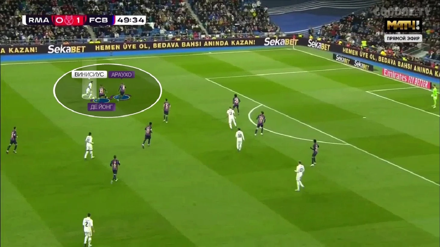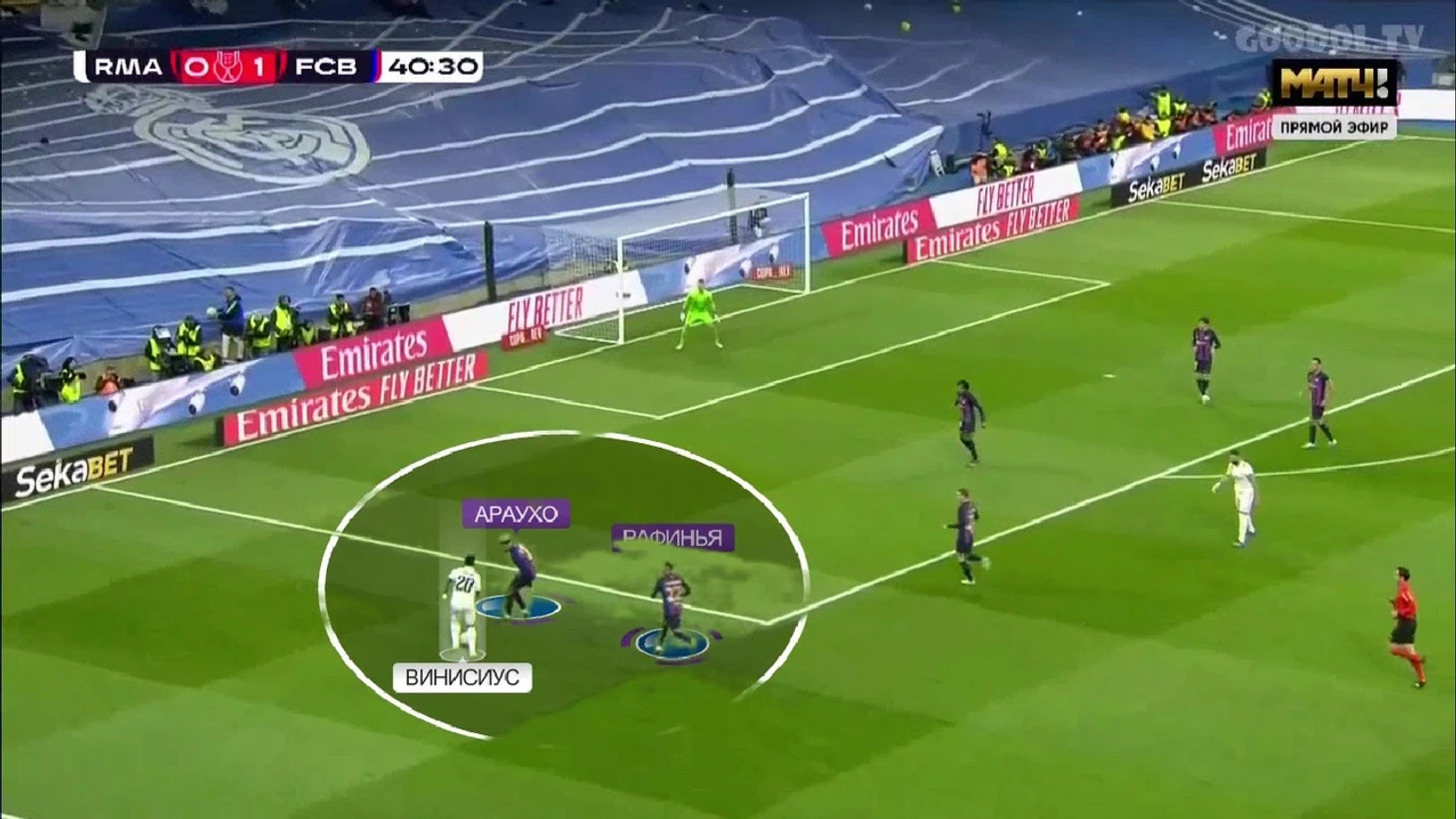 На фланге Араухо у «Барселоны» было гораздо больше свободы. Это сознательное решение, можно проследить за Винисиусом – он располагается очень узко при давлении: