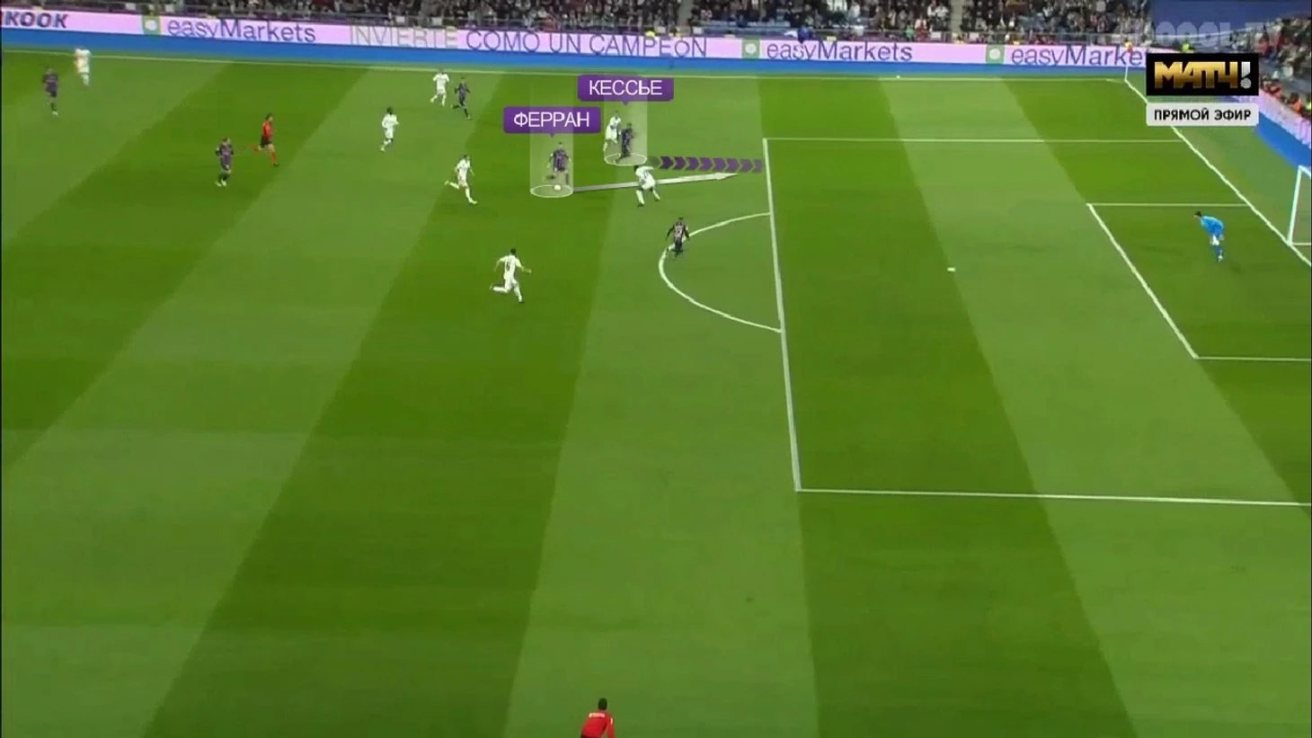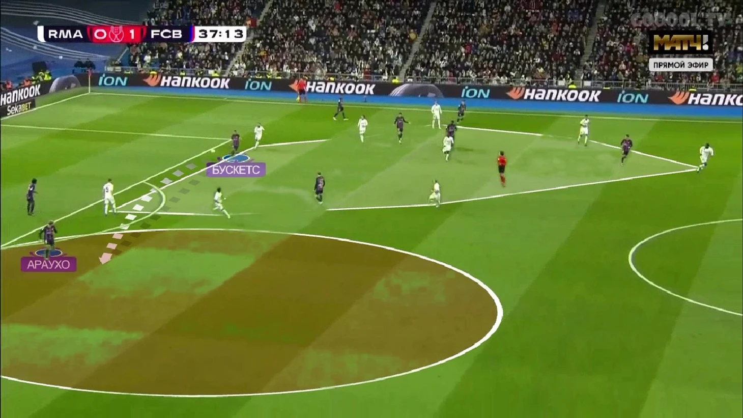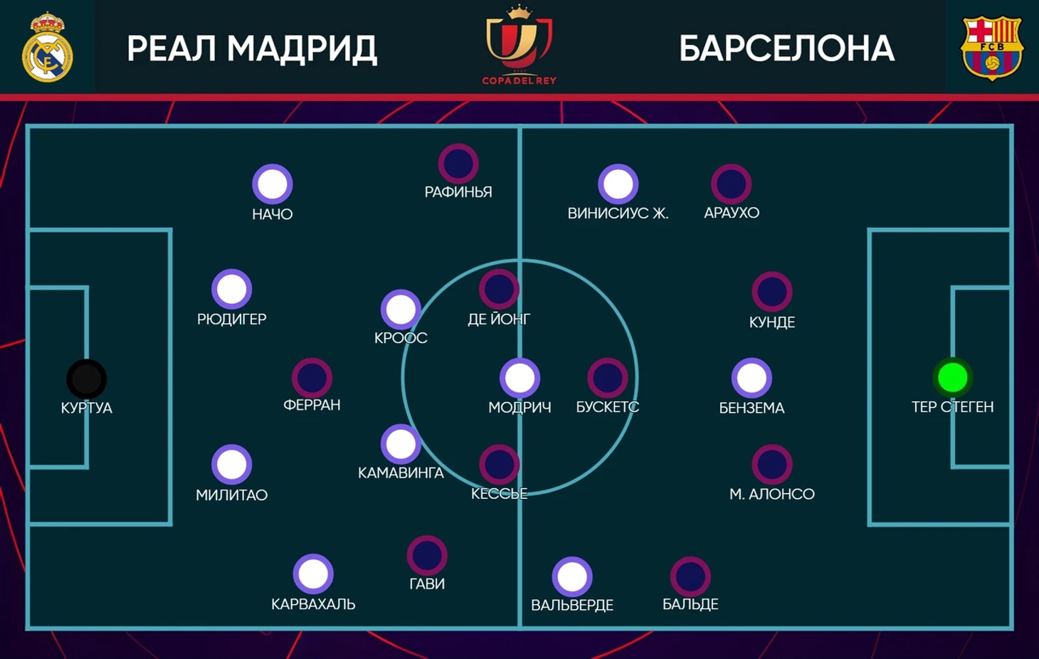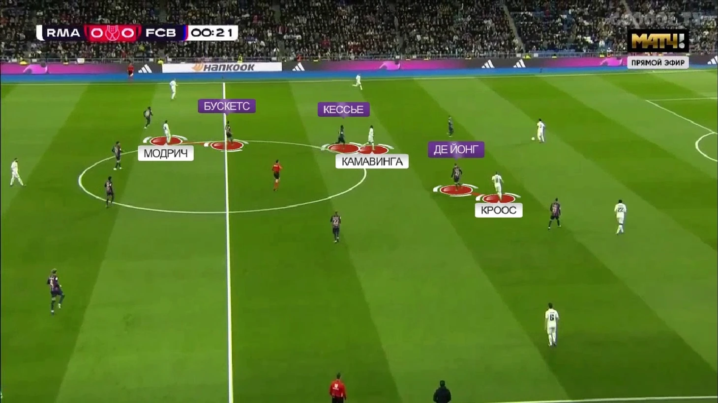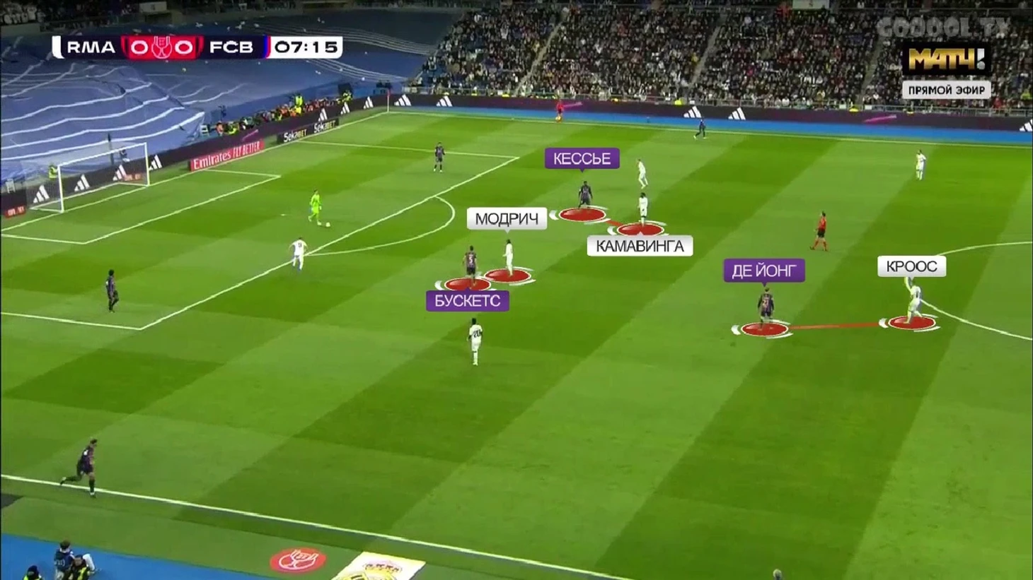 В начале встречи «каталонцы» пытались играть активно без мяча. В центре поля, как и «Мадрид», использовали персональные ориентировки: Бускетс – Модрич, Кессье – Камавинга, де Йонг – Кроос: