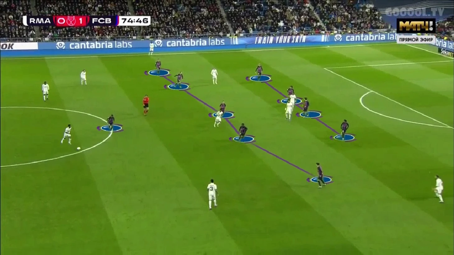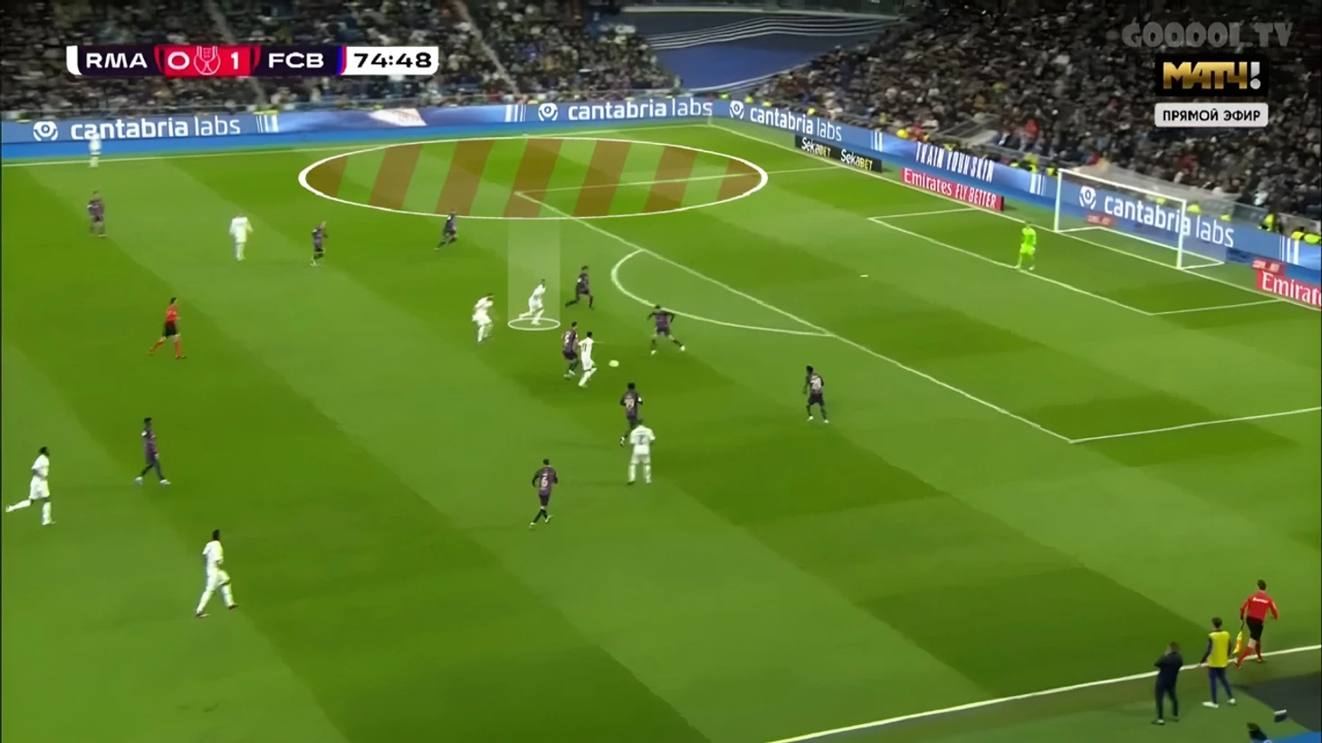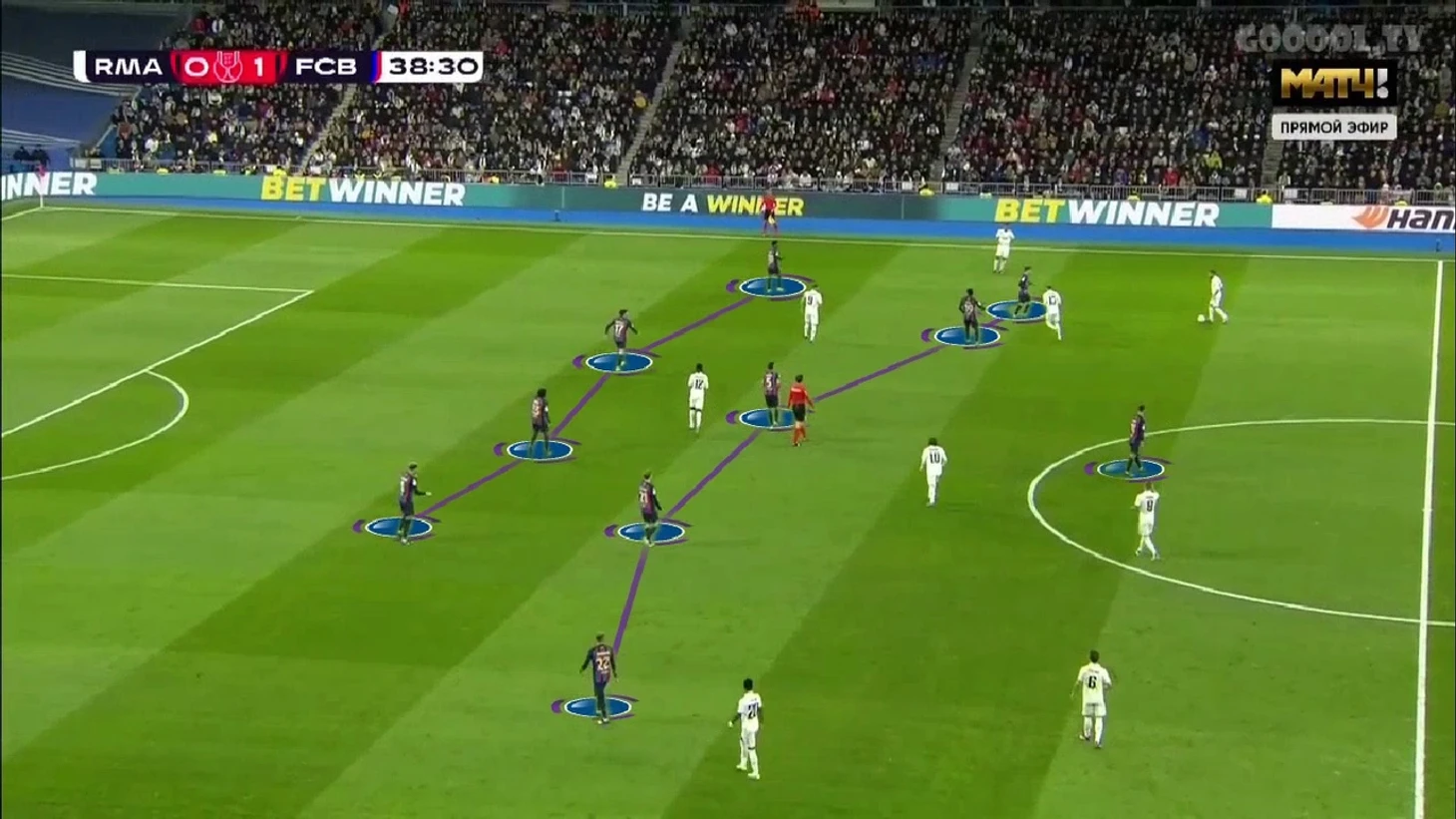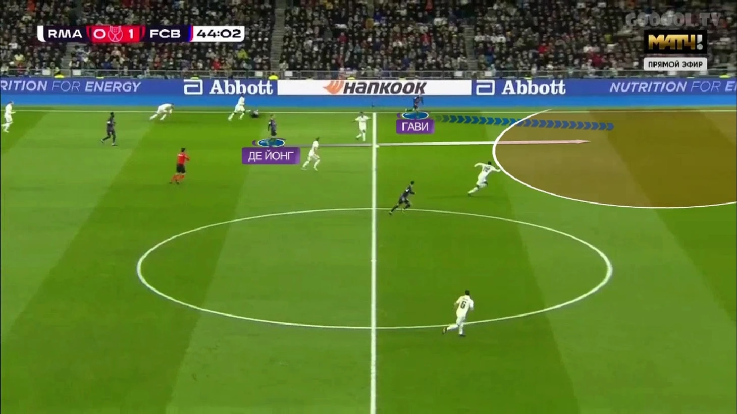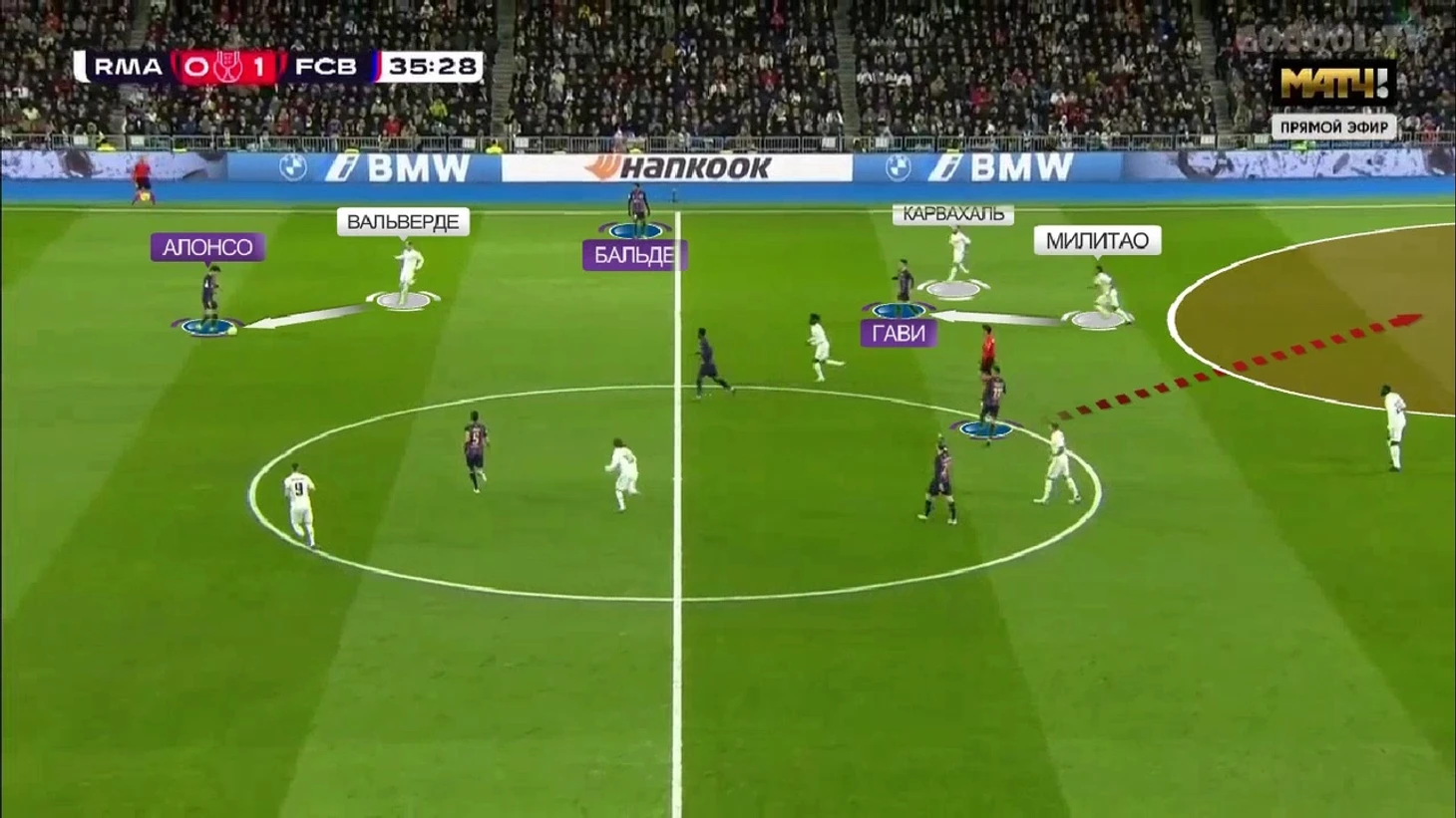 Это стало возможным благодаря тому, что Гави, который номинально стартует на позиции левого вингера, на деле не играет как классический вингер. Он играет узко, скорее как ещё один центральный полузащитник. Из-за этого Милитао может легко контролировать его. Таким образом слева сложно постоянно создавать ситуации 2-в-1.
