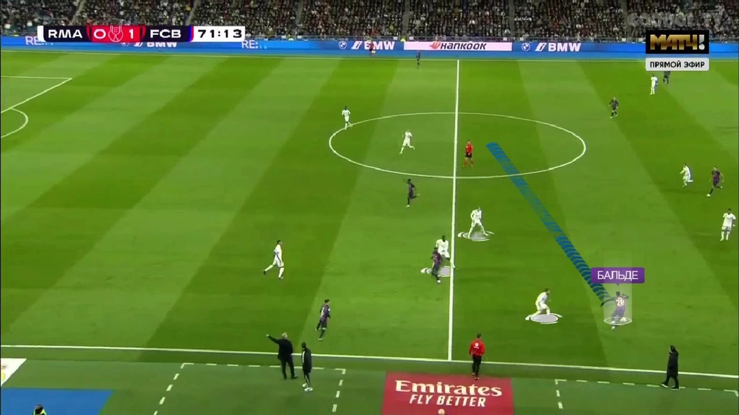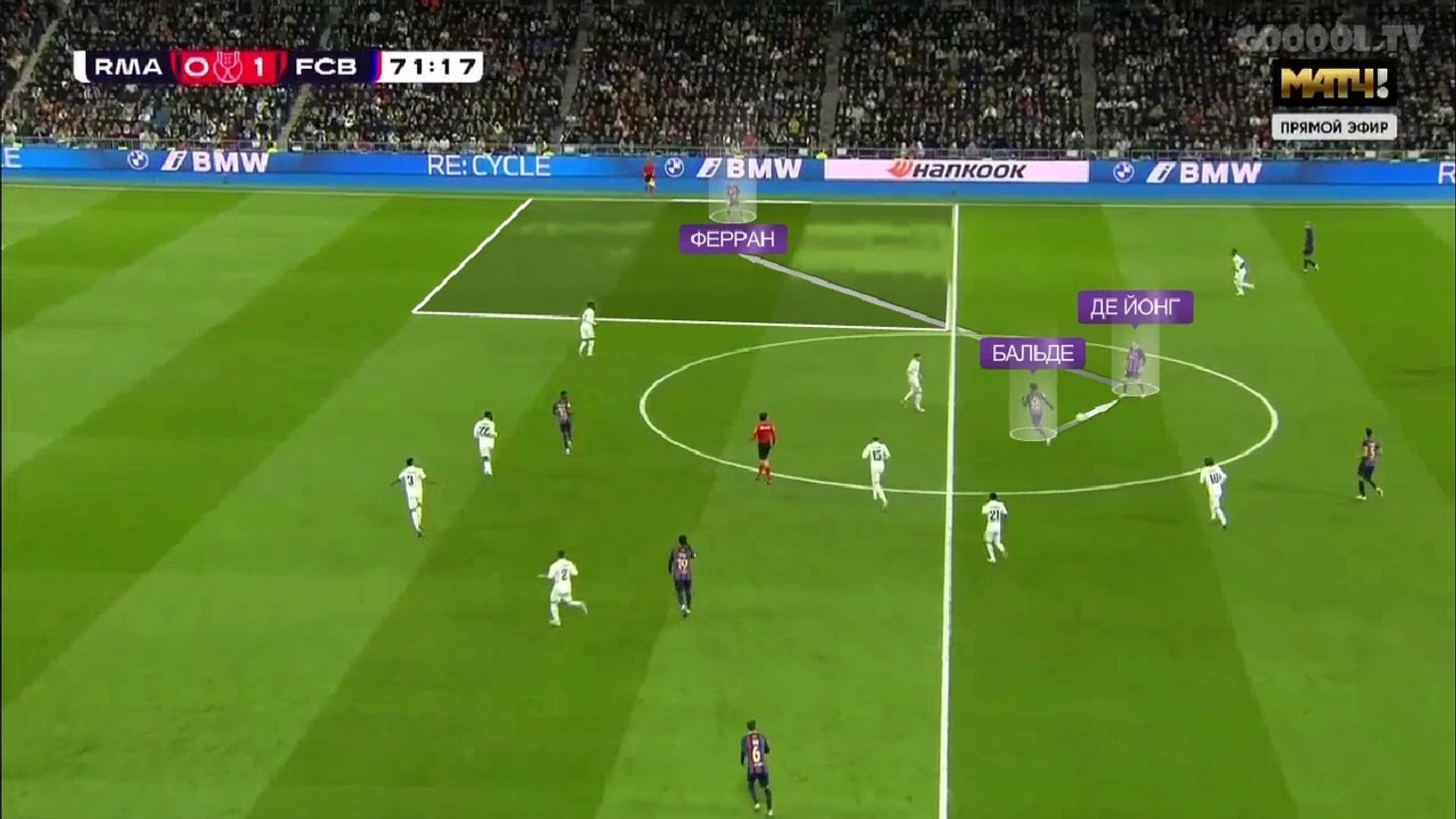 Через несколько пасов мяч доходит до Бальде, который продвигается в центре, тем самым отрезав трёх игроков, а затем через де Йонга мяч получает Ферран Торрес, у которого куча пространства: