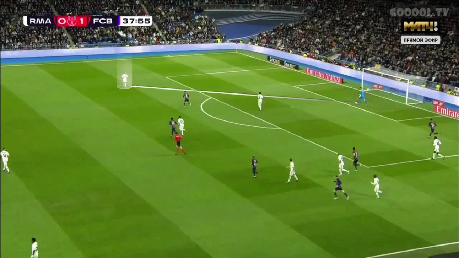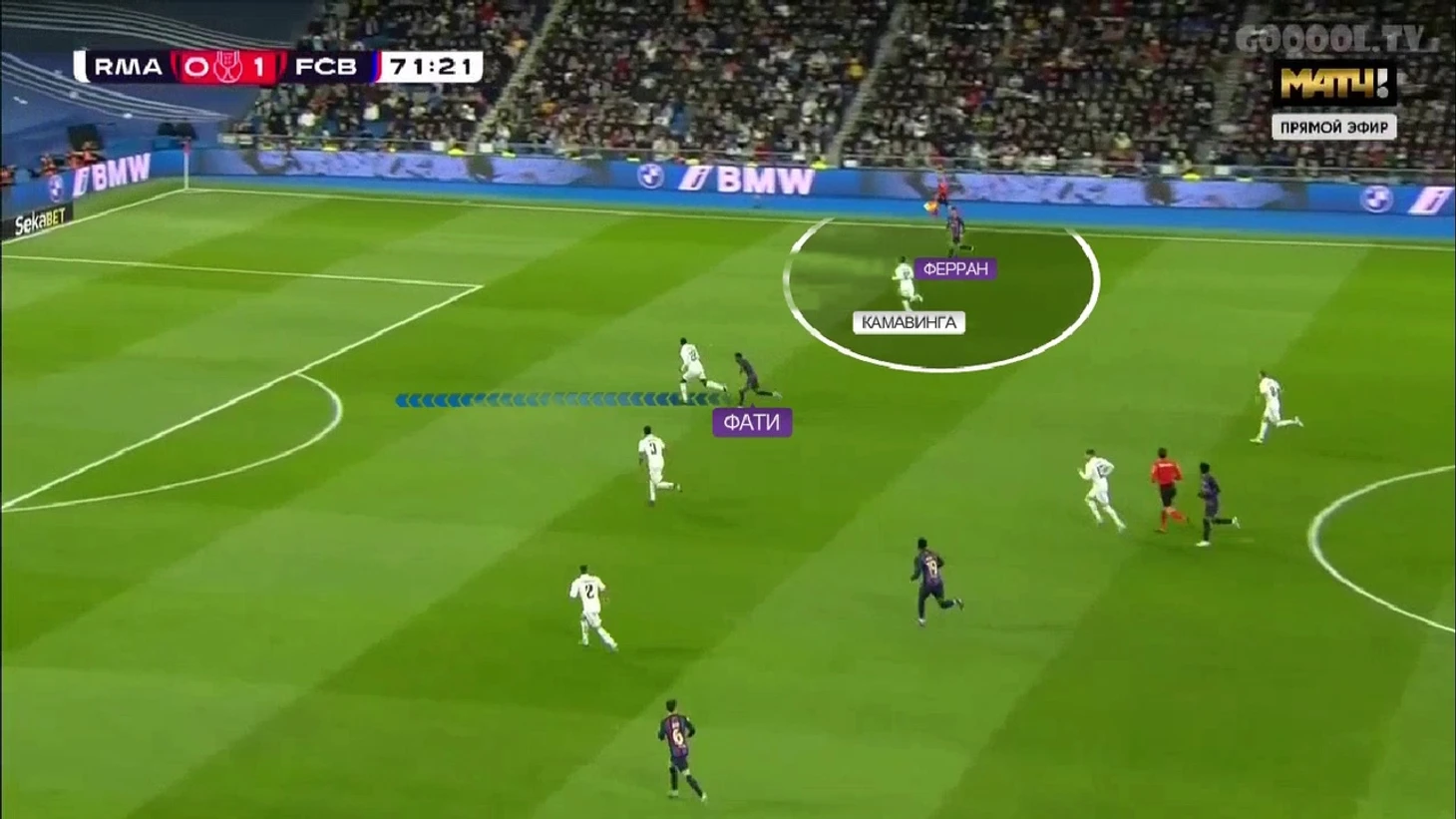 Ансу Фати делает рывок, на который реагирует Рюдигер, из-за чего Ферран остаётся 1-в-1 с Камавингой. Торресу не составит труда на скорости обыграть Эдуарду: