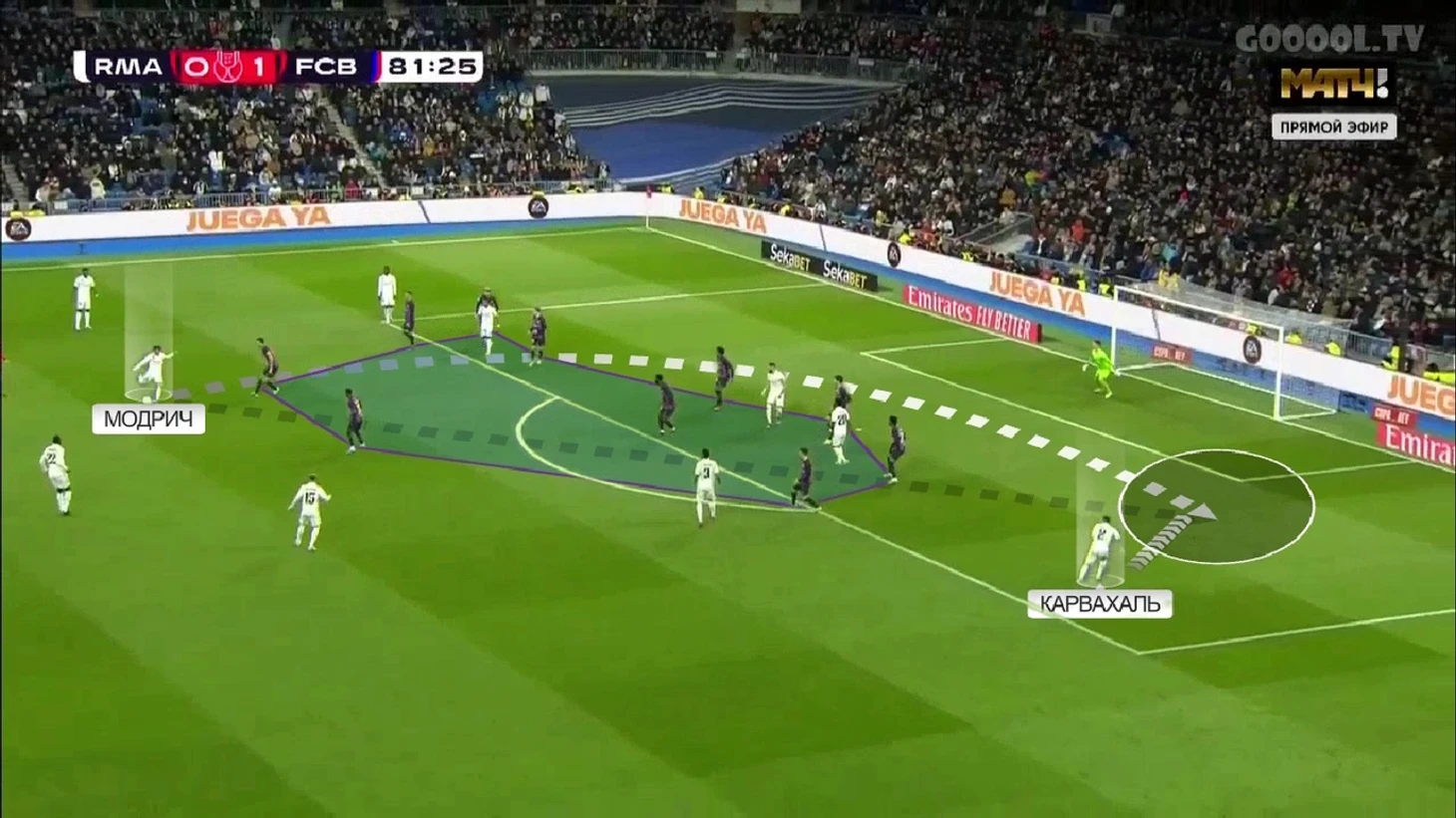 С правого фланга пришло больше опасности: в низком блоке «Барселоне» было тяжело контролировать забегания Карвахаля из глубины. В моменты, когда его находили пасом было действительно опасно:
