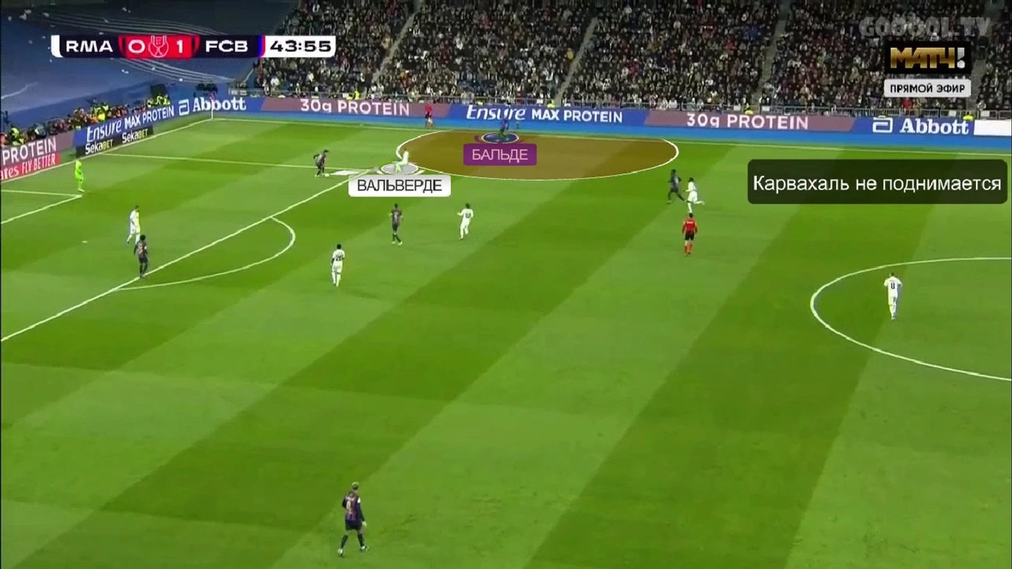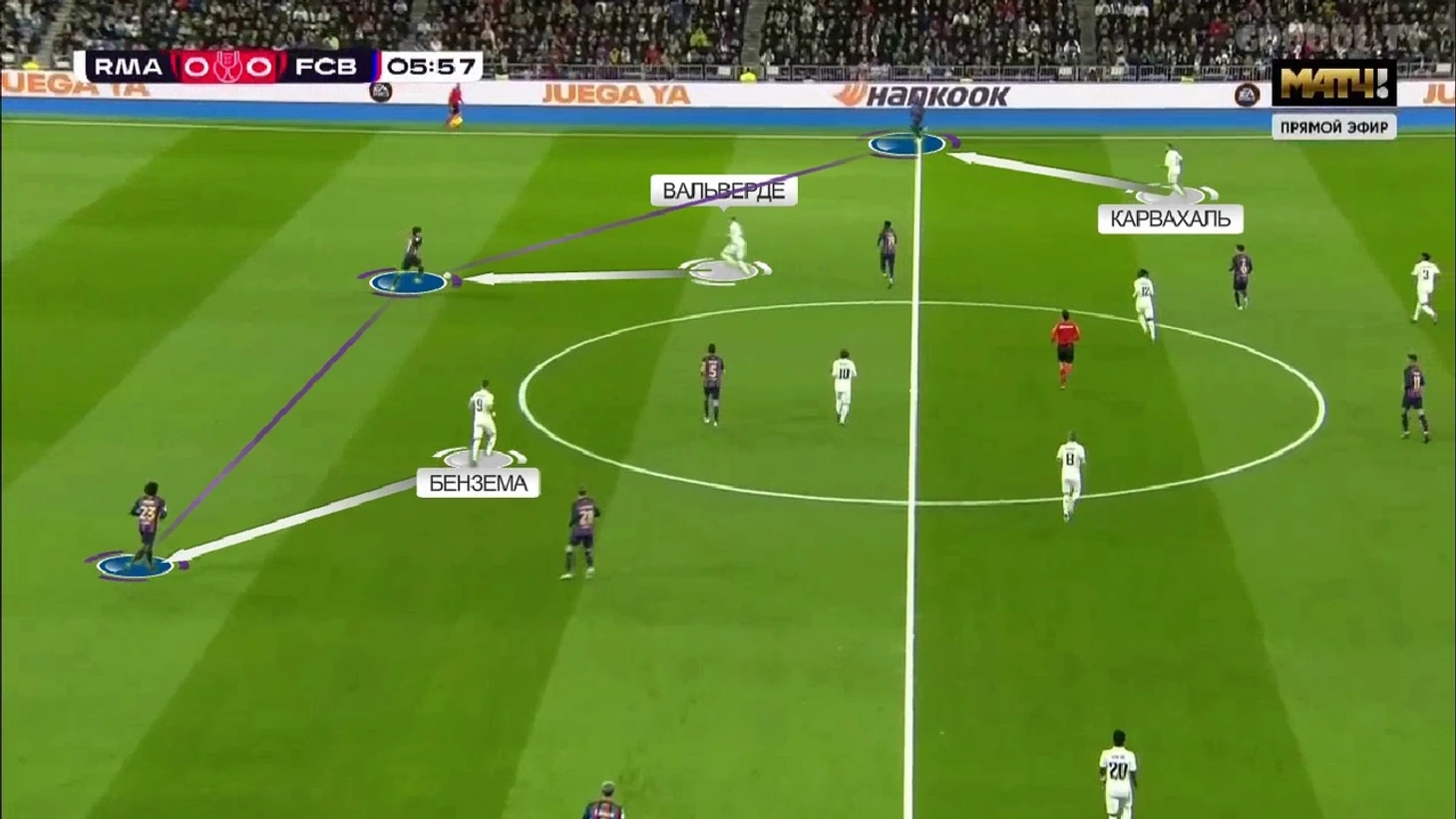 Одного центрального защитника оставляли свободным, но когда мяч доходил до него, Вальверде выдвигался давить. Отличие – смелая роль Карвахаля, которая заключалась в том, чтобы высоко подниматься к Бальде: