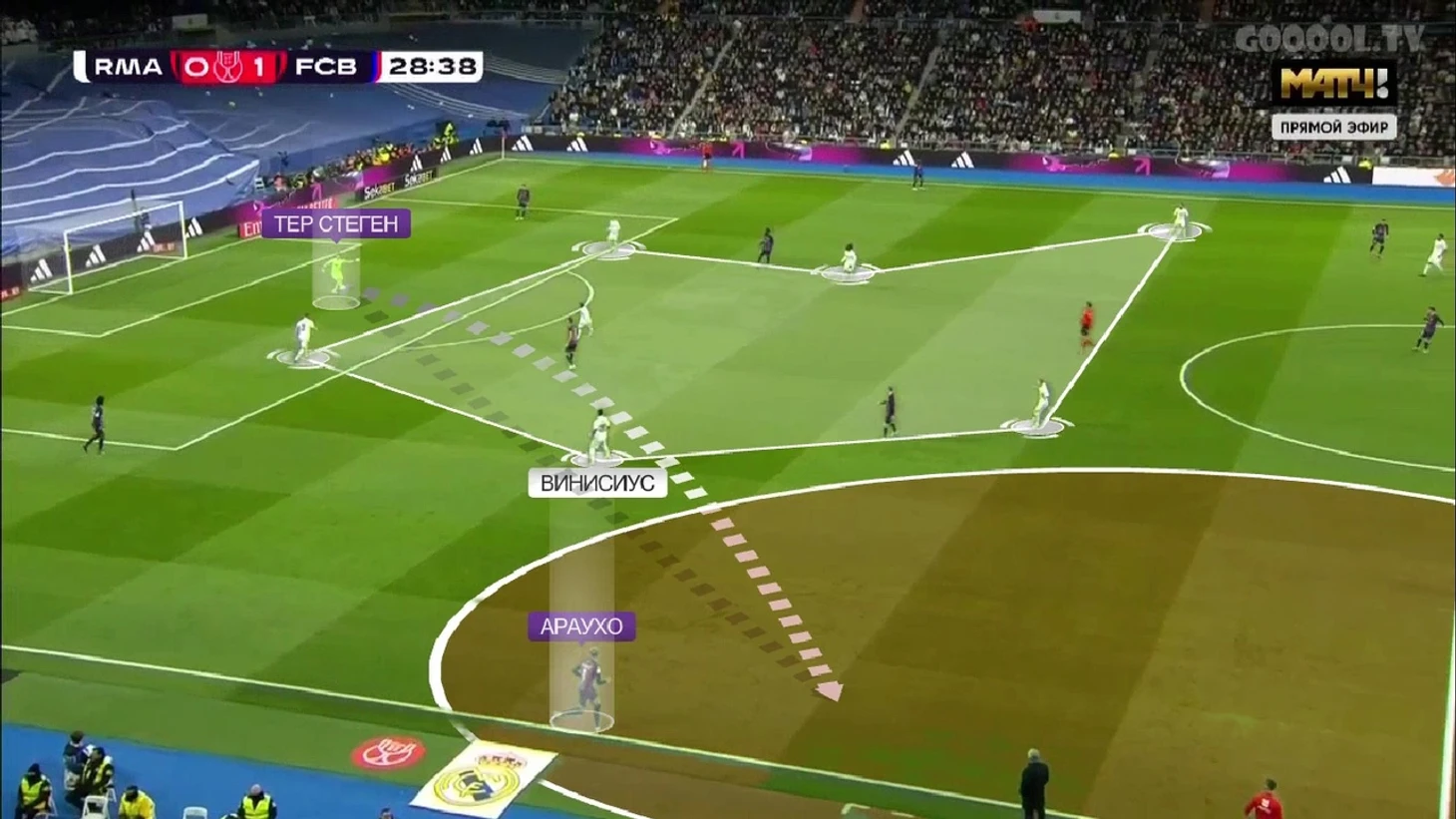 Выбор более свободного фланга понятен – Араухо не так силён при игре с мячом, поэтому и многие соперники «Барселоны» оставляют этот фланг более свободным. Ставка в целом тоже сыграла, но варианты для выхода у «каталонцев» далеко не всегда, но находились. Самый очевидный – тер Стеген перебрасывает прессинг «Мадрида» на свободного Араухо. Для Марка, играющего ногами на высочайшем уровне это не представляет вообще никакого труда: