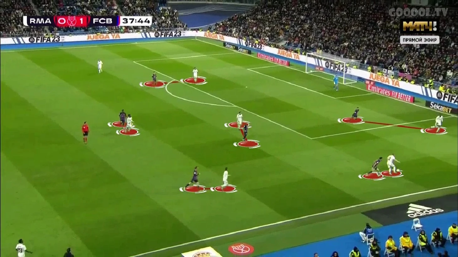 Но чаще мы видели ситуации, где в зоне мяча «Барса» прессингует интенсивнее, создаёт ситуации 1-в-1, но дальний фланг был свободным. Например здесь, для того, чтобы запрессинговать левый фланг «Мадрида», Араухо поднимается к Начо: