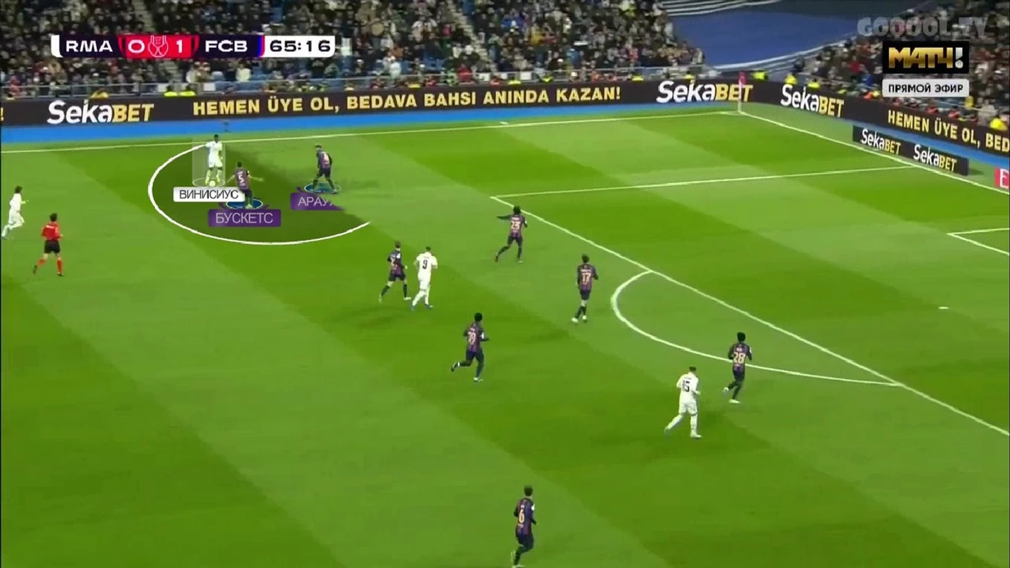 Рональд Араухо безусловно очень хорош 1-в-1 и уже может считаться специалистом по игре против Винисиуса, но надо понимать, что командные механизмы очень хорошо страхуют уругвайца, и без этой помощи даже Араухо было бы тяжело обороняться против Винисиуса.