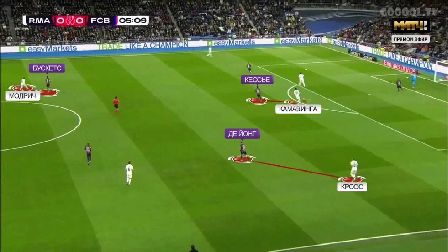 Функции игроков в прессинге тоже были похожими – в центре поля работали по персональным ориентировкам: Модрич играл по Бускетсу, Камавинга по Кессье, а Кроос по де Йонгу: