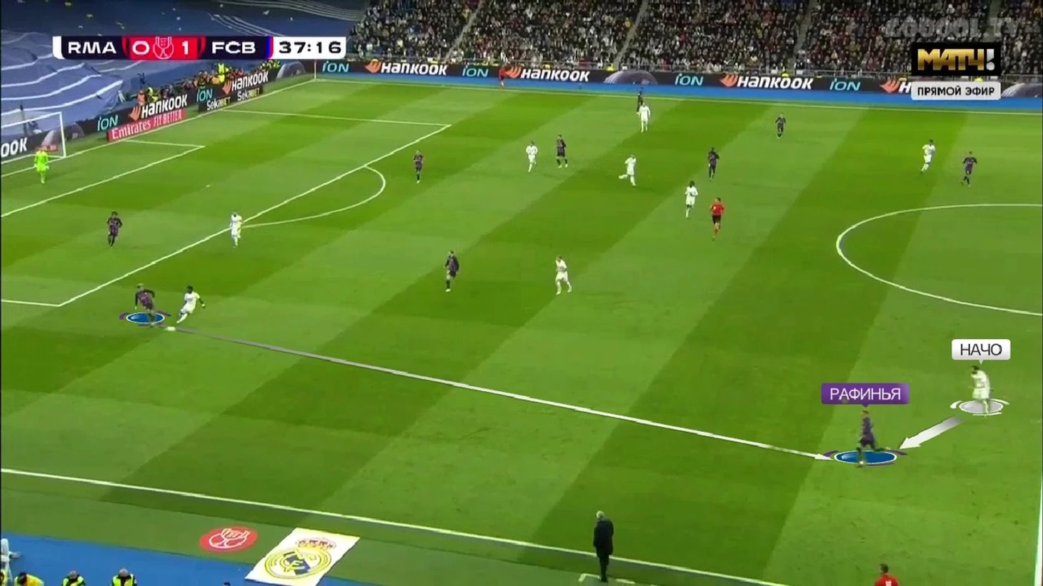 Кроос решает надавить на Рафинью вместе с Начо, но бросает де Йонга, и голландец бежит открываться в свободную зону, а Рафинья делает пас на ход – схема рассыпалась: