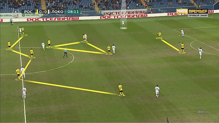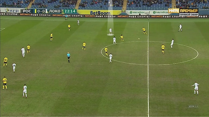 «Ростов» испытывал проблемы и при откате в 5-4-1. Во-первых, хозяева часто теряли игроков за спинами. Во-вторых, на флангах не было толковой подстраховки при переходе в прессинг из компактного блока: крайние полузащитники выбрасывались вперед, фланг за спиной оставался свободным, а защитники не поднимались (Чернова напрягал Камано, Осипенко не рисковал).