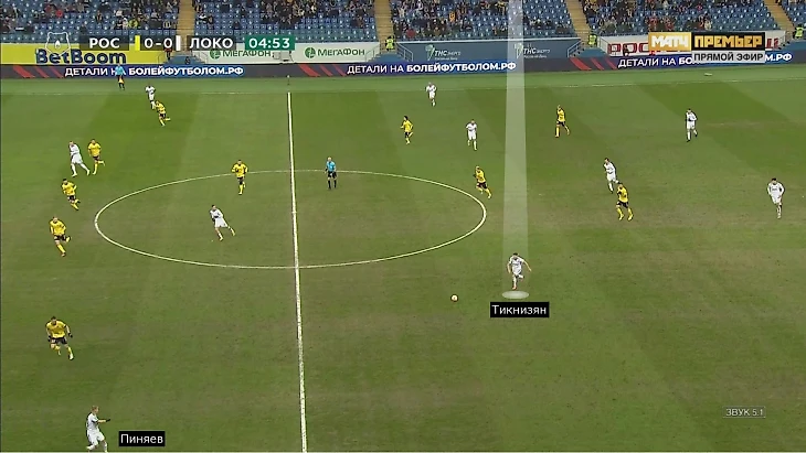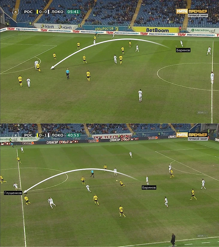 Галактионов подготовил несколько вертикальных идей. Первая – целенаправленные забросы на Дзюбу, чтобы Артем сбрасывал на Глушенкова или Пиняева. Вторая – закидушки за спину для Пиняева и Глушенкова. Третья – проникающие передачи в финальную треть, где «Локо» располагался четверкой и принимал мяч спиной к воротам.