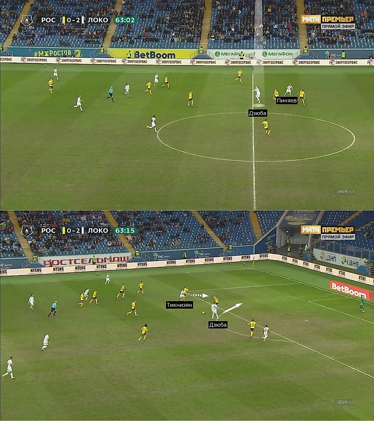 Дзюба помог и с началом третьей атаки: сбросил на Пиняева после выноса Кузьмичева, а затем играл в стенку с Тикнизяном после его классического рывка в полуфланг.