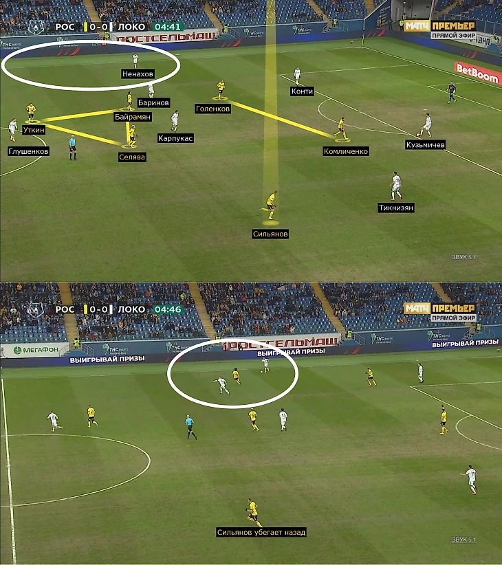 Периодически у «Ростова» не было никакой системы. Здесь Байрамян остался против Ненахова и Баринова, а справа Сильянов все же добежал до Тикнизяна. Хорен дотянулся до мяча, но его подобрал Карпукас и перевел налево, откуда Сильянов уже убежал в защиту, тогда как перед Наиром открылась огромная сводобная зона (Уткин играл в глубине, а Селява встречал Карпукаса).