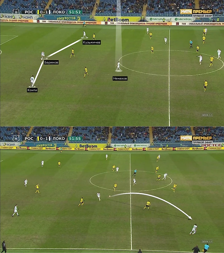 В голевой атаке сошлись почти все позиционные задумки «Локо» и ошибки «Ростова». Первое – легкая доставка мяча на фланг, когда Баринов отыграл на Карпукаса (внимание Чернова на Ненахове, а Комличенко выбросился к Конти).