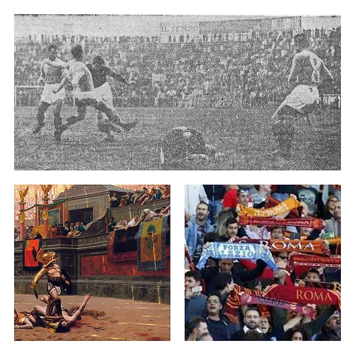 На одном из фото эпизод матча декабря 1945 года: в то время как игроки двух команд рубятся за мяч, на земле уже лежит вырубленный игрок, позже у него выявят перелом скулы. Страсти на трибунах тоже зашкаливают, перформансы обеих команд обсуждают и осуждают долго, беспорядки трусят весь Рим до глубокой ночи. В личных встречах перевес на стороне Ромы, а их «вечный капитан» Тотти лидер и по матчам и по голам в Капитолийском Дерби.