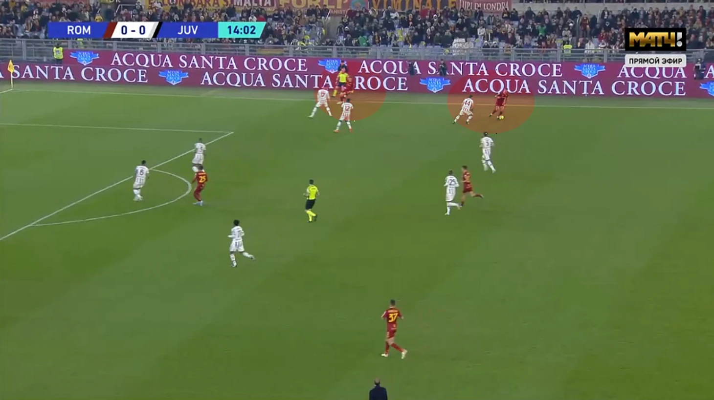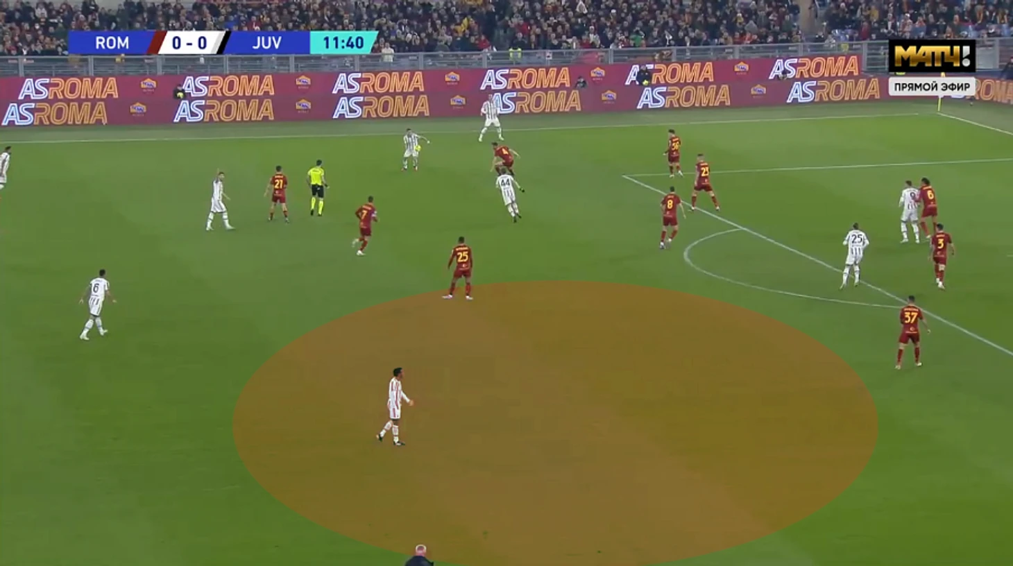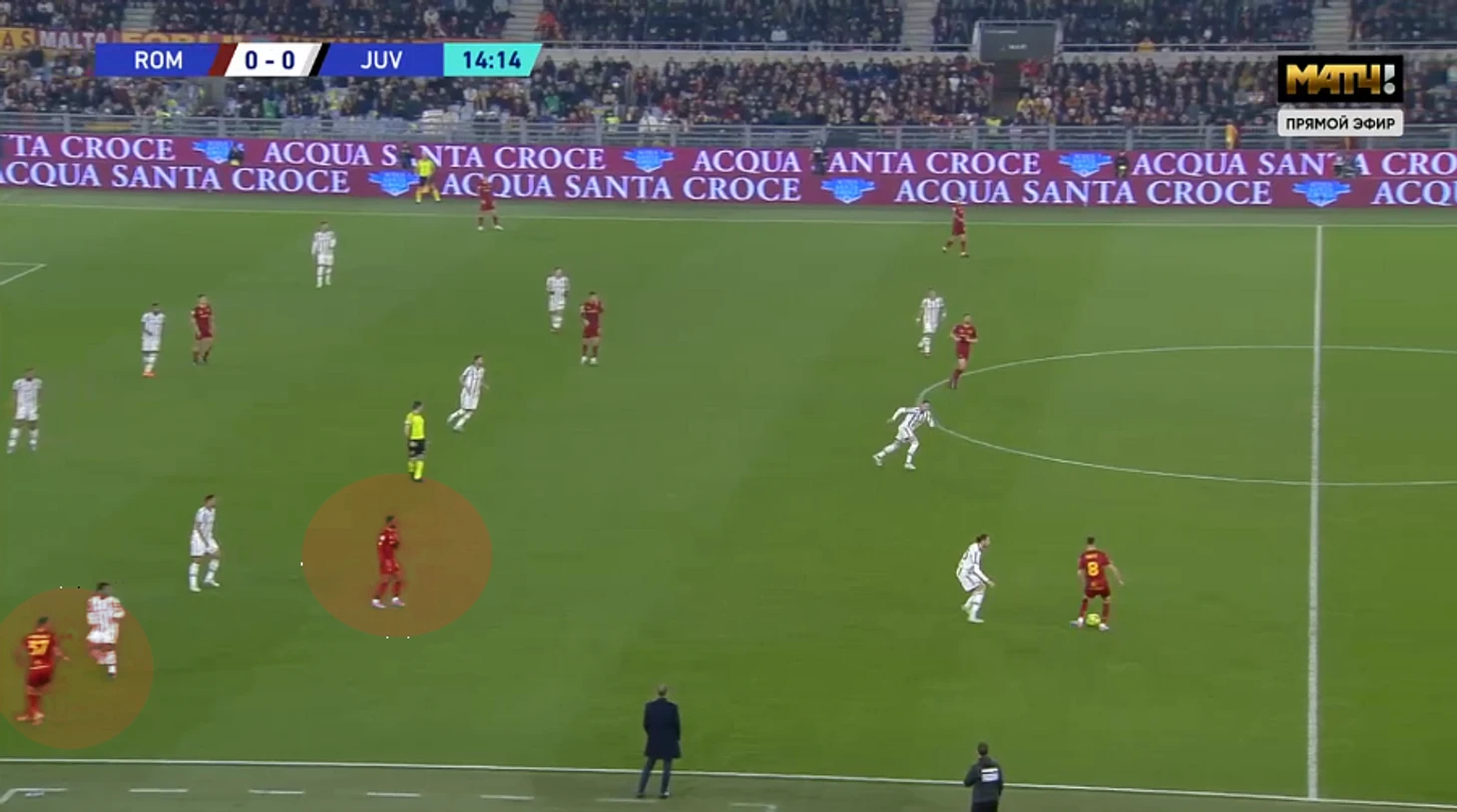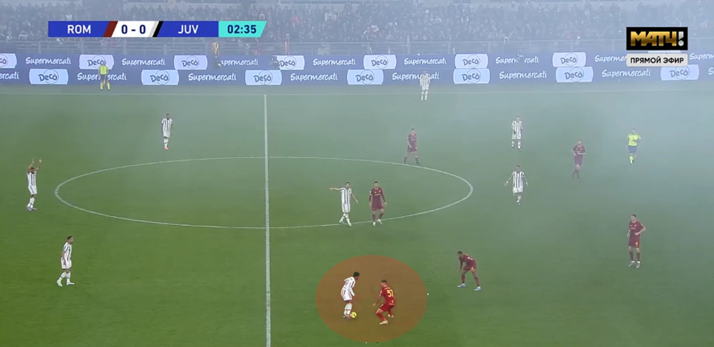 «Рома» отвечала на это пятеркой защитников в линию, выше располагались Брайан Кристанте и Неманя Матич, а третья линия состояла из Джорджиньо Вейналдума, Лоренцо Пеллегрини и Пауло Дибалы. Получалась формация 5-2-3, в которой фланговых защитники Леонардо Спинаццола (слева) и Никола Залевски (справа) поднимались выше, когда «Ювентус» переводил мяч на соответствующий фланг.