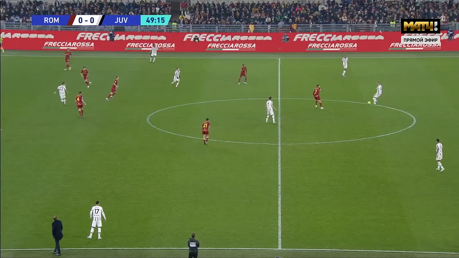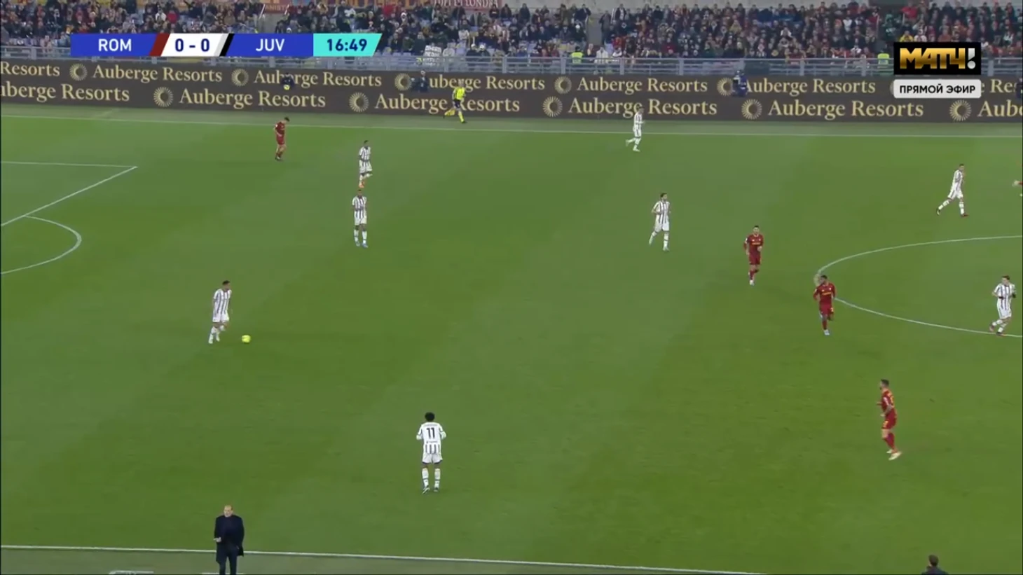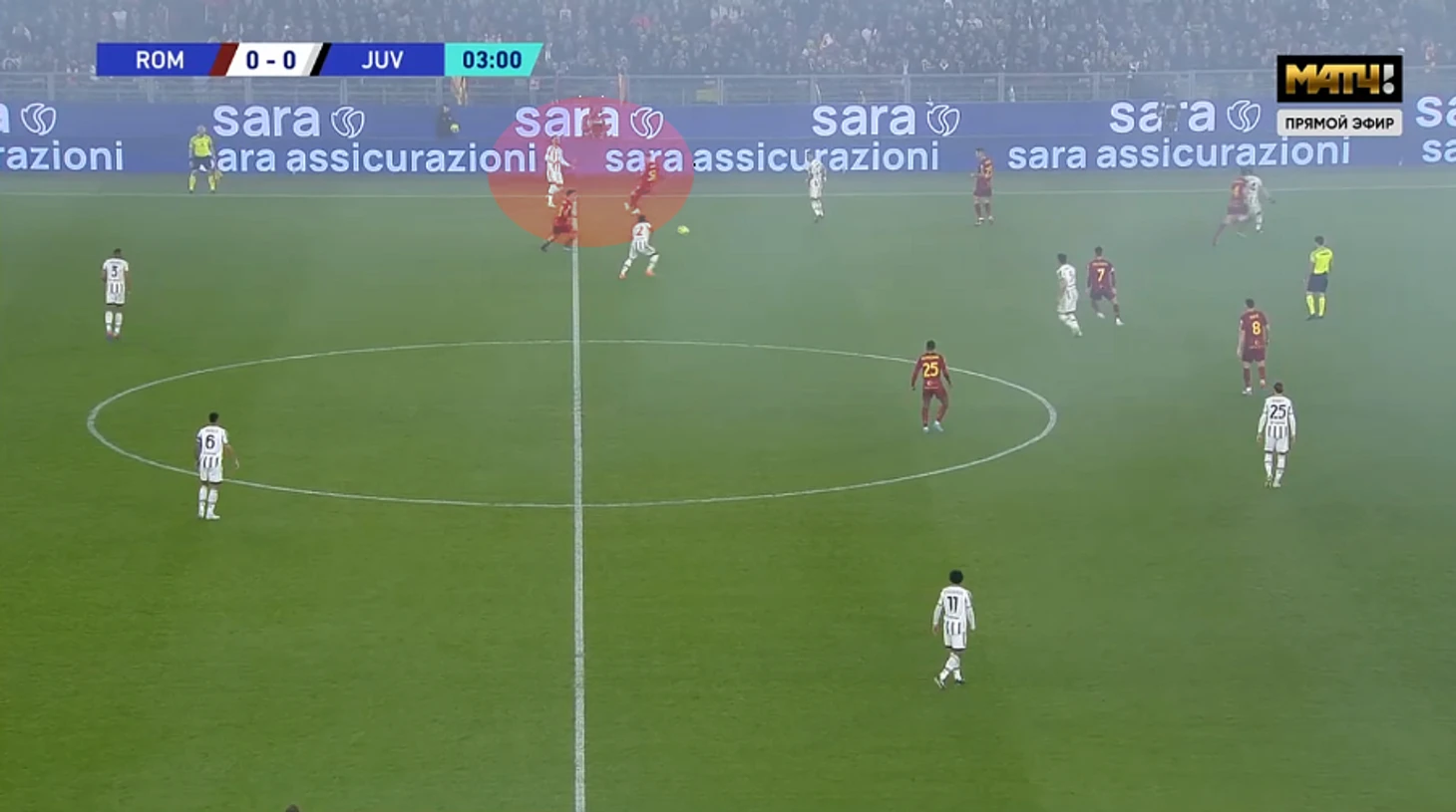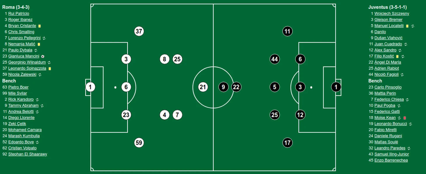 «Рома» отвечала на это пятеркой защитников в линию, выше располагались Брайан Кристанте и Неманя Матич, а третья линия состояла из Джорджиньо Вейналдума, Лоренцо Пеллегрини и Пауло Дибалы. Получалась формация 5-2-3, в которой фланговых защитники Леонардо Спинаццола (слева) и Никола Залевски (справа) поднимались выше, когда «Ювентус» переводил мяч на соответствующий фланг.