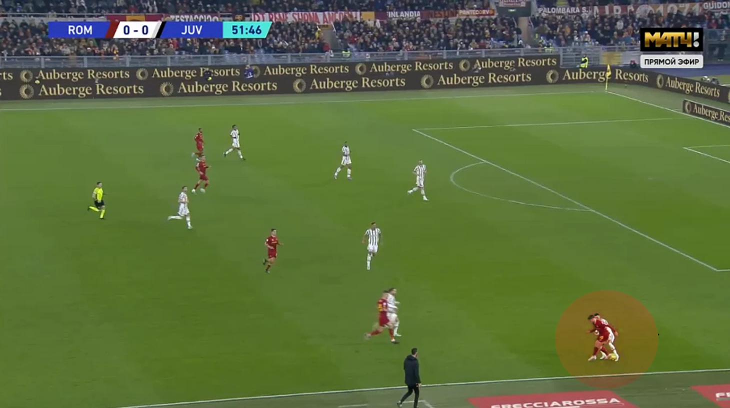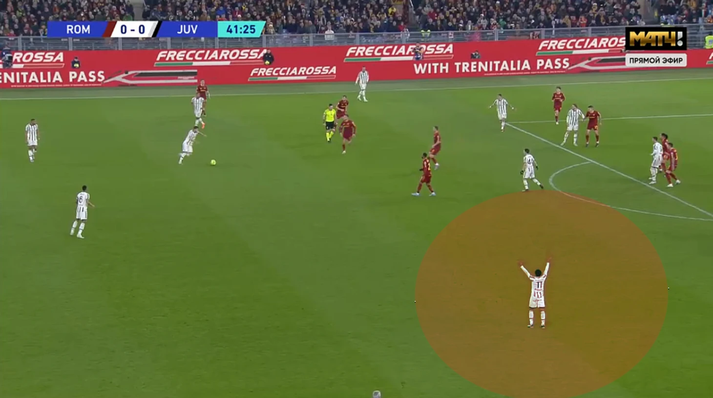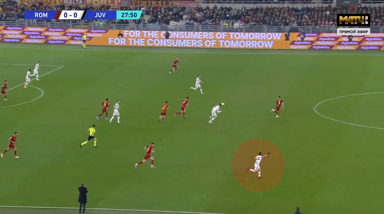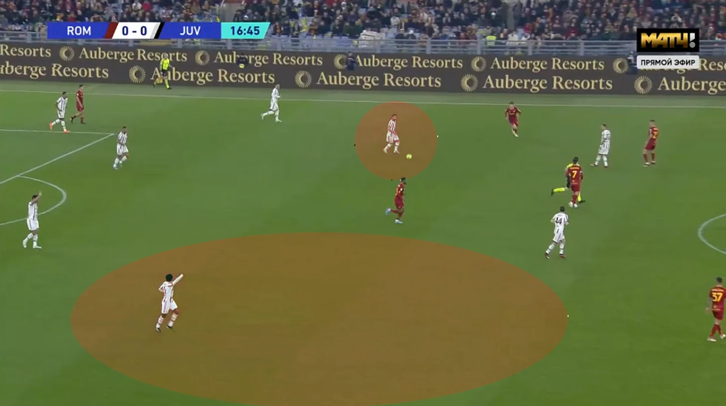 «Рома» отвечала на это пятеркой защитников в линию, выше располагались Брайан Кристанте и Неманя Матич, а третья линия состояла из Джорджиньо Вейналдума, Лоренцо Пеллегрини и Пауло Дибалы. Получалась формация 5-2-3, в которой фланговых защитники Леонардо Спинаццола (слева) и Никола Залевски (справа) поднимались выше, когда «Ювентус» переводил мяч на соответствующий фланг.