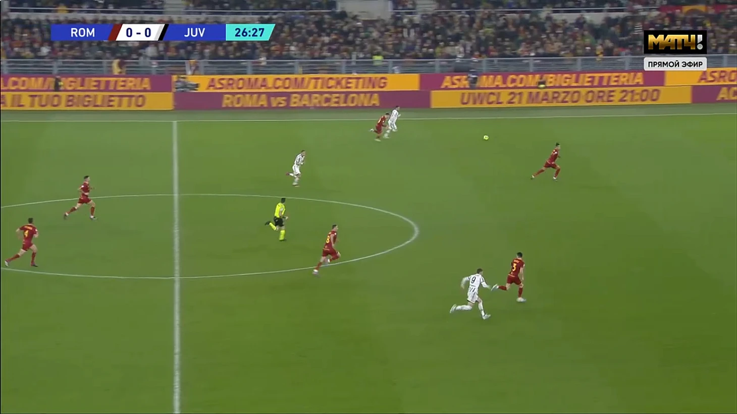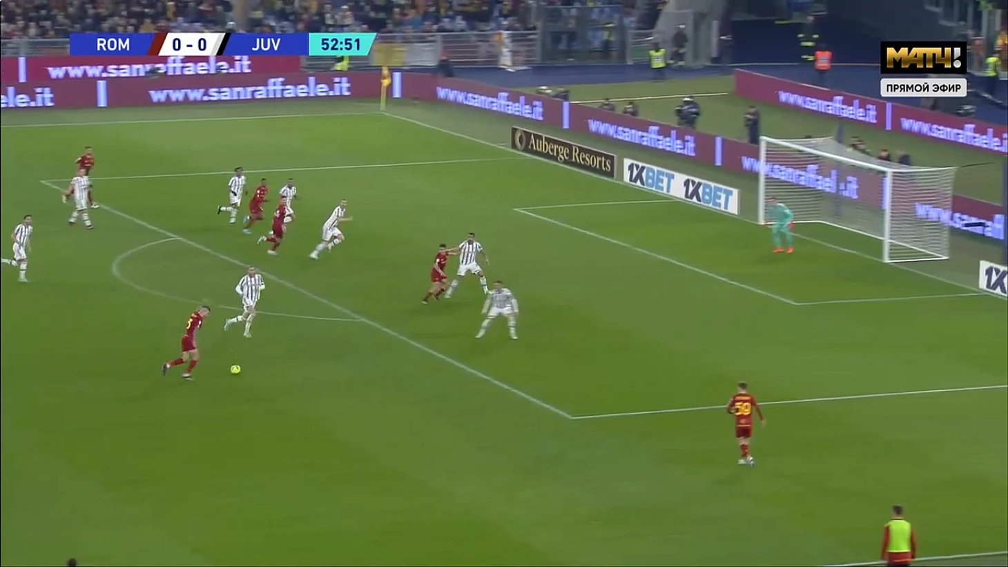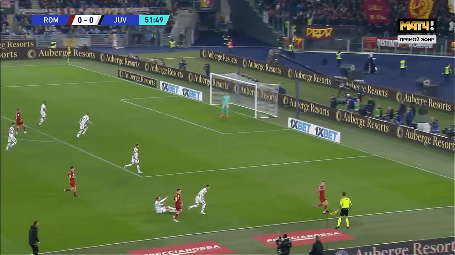 В данном эпизоде «Рома» пытается провести быструю атаку по правому флангу. Костич только-только оказался в кадре. Повезло, что передача оказалась неточной.