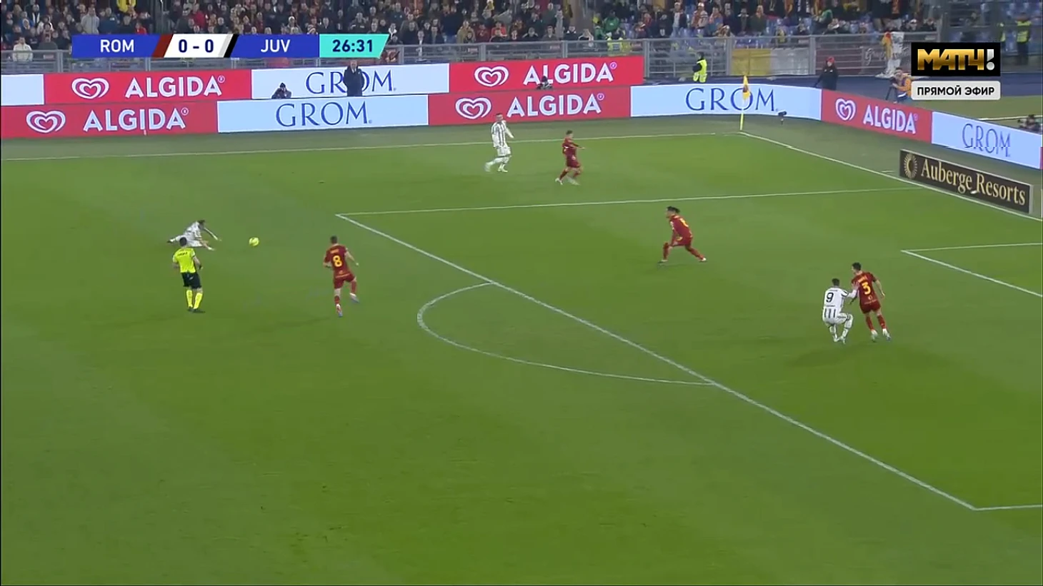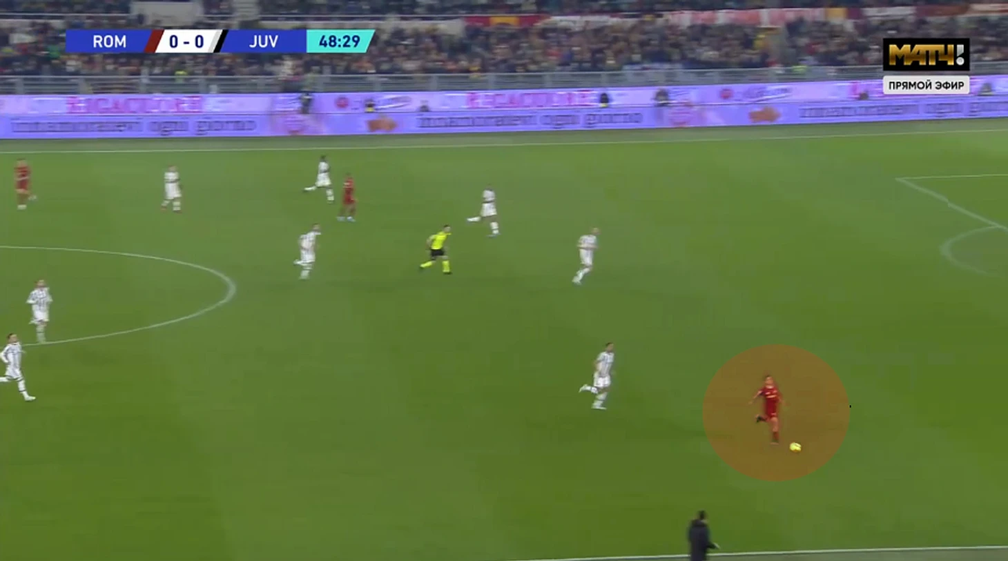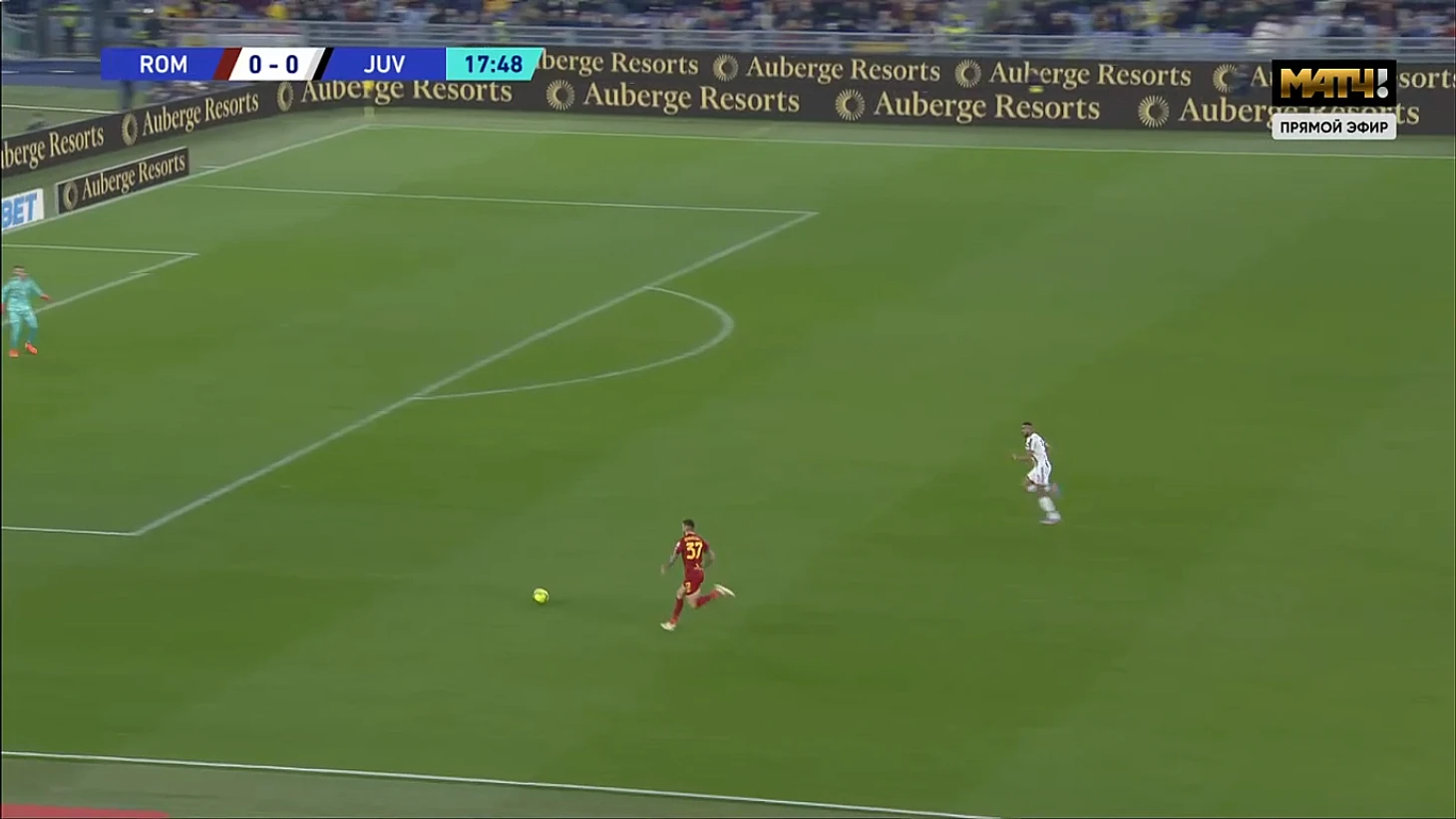 В данном эпизоде «Рома» пытается провести быструю атаку по правому флангу. Костич только-только оказался в кадре. Повезло, что передача оказалась неточной.