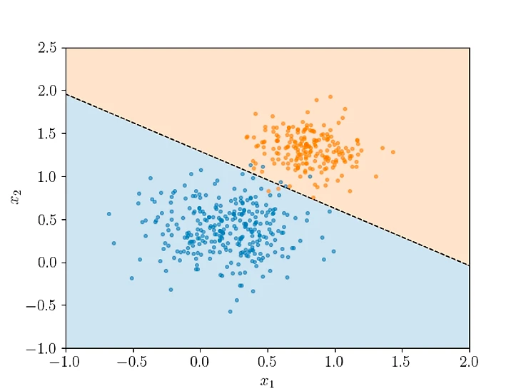 Вспомним школьное уравнение прямой x2 = ax1+b (где a – коэффициент угла наклона, а b – коэффициент сдвига по оси x2), и тогда задача сводится к тому, что нужно подобрать такие значения коэффициентов, чтобы разделить плоскость при помощи этой прямой таким образом, чтобы максимальное число точек было в зоне того же цвета. Наша модель отличается от примера на графике только тем, что пространство независимых переменных – многомерное, и наглядно изобразить его не получится.