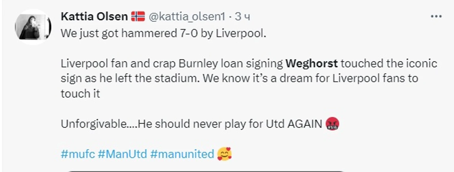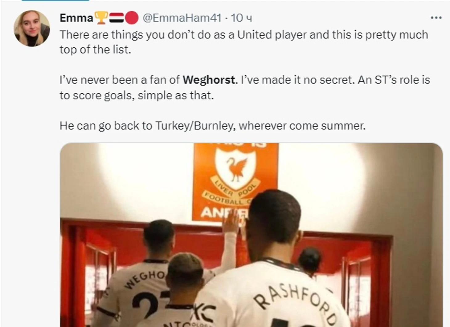 Есть и те болельщики «Ман Юнайтед», кто к поступку Вегорста относится спокойно. Например, автор Sports.ru и создатель телеграм-канала «Ten Hag ball» Дмитрий Письменский: