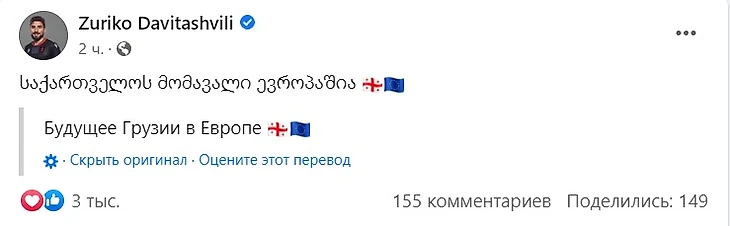 Футболист «Бордо» Зурико Давиташвили написал короткий пост на грузинском языке: «Будущее Грузии в Европе».