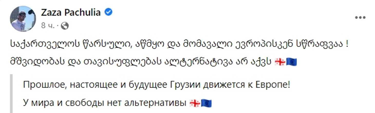 Чемпион НБА в составе «Голден Стейт» Заза Пачулия оставил пост в своих соцсетях, написав: «Прошлое, настоящее и будущее Грузии движется к Европе! У мира и свободы нет альтернативы».