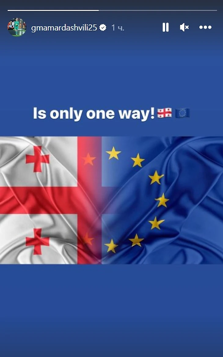 Еще один футболист, вратарь «Валенсии» Георгий Мамардашвили выложил в сторис картинку с флагами Грузии и Евросоюза и подписал ее: «Есть только один путь».