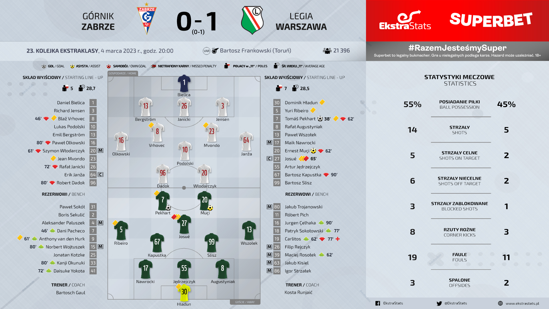 Перед самым перерывом забжане чуть не сравняли счет. Бергстрём и Йенсен минимально не дотянулись до мяча. Во втором тайме забжане не оставляли попыток сравнять счет. А на 62-ой минуте Франковски принял второе спорное решение в матче. Ван дер Хурк в борьбе с Аугустыняком отмахнулся локтем, выбив футболисту варшавян два зуба. Арбитр оценил такие действия форварда хозяев лишь на желтую карточку, а через три минуты оставил вдесятером варшавян, показав второй горчичник Жосуэ.