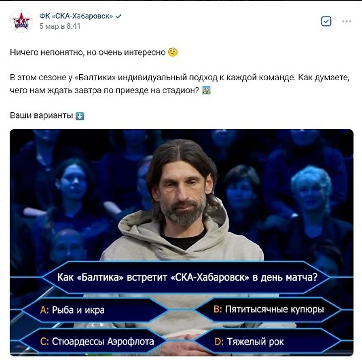 Первый матч 2023 года для калининградцев прошел в родных стенах и в очередной раз собрал максимальную аудиторию в туре. А с учетом событий, происходящих на стадионах в РПЛ, матч «Балтики» и хабаровского СКА и вовсе стал четвертым в уик-энде по числу посетивших зрителей. Неожиданно, но тему встречи соперника решил подогреть сам соперник, устроив маленький опрос на страницах своих соцсетей.
