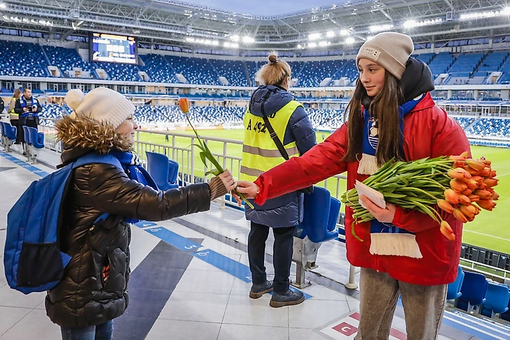 А перед стартовым свистком матча свои букеты получили лучшие воспитанницы академии клуба прямо на футбольном поле от игроков стартового состава. Выглядело очень мило.