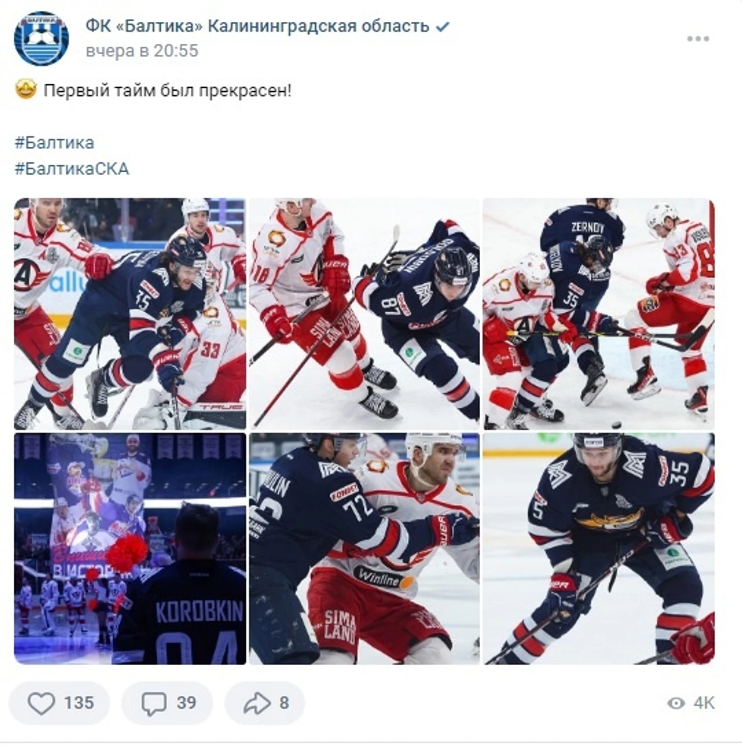 SMM-служба «Балтики» отличилась и еще в одном моменте. Встреча запада и востока была перенесена с воскресенья на понедельник под вывеской «Матч тура» ради трансляции на федеральном телеканале. Калининградские болельщики эту новость встретили с большой досадой, ведь футбол в выходные — куда приятнее, чем в будний день. Все бы хорошо, но те, кто не сумел прийти на стадион в понедельник в надежде на трансляцию, в первом тайме остались ни с чем. Матч плей-офф КХЛ между «Автомобилистом» и «Металлургом» прилично затянулся и футбол болельщики смогли увидеть только с 38-й минуты. Пресс-служба Балтийцев отреагировала на это с иронией