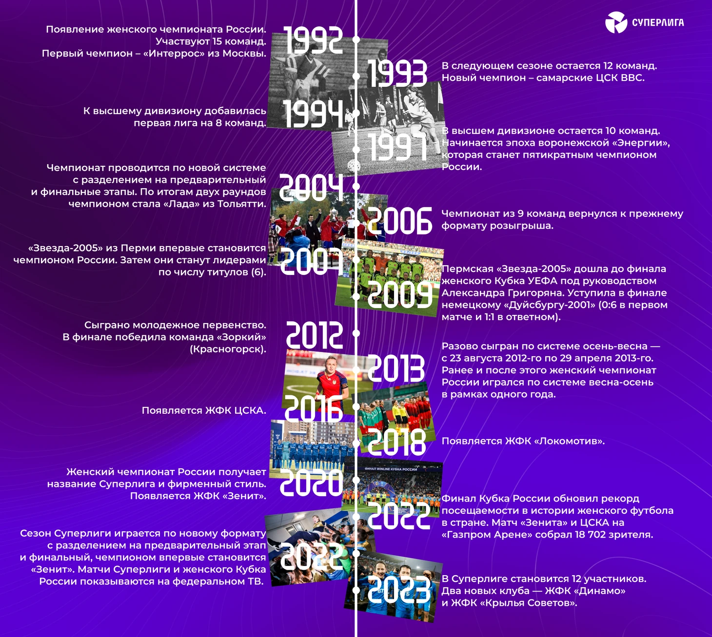 Женский чемпионат России по футболу идет с 1992 года. За это время в нем отменились многие команды. Несколько раз создавался и исчезал женский «Спартак», собран и расформирован красногорский «Зоркий», в Воронеже были городское представительство РФС и сильнейшая команда «Энергия»: ее лучшие выпускницы Елена Данилова и Елена Терехова зажигали на молодежном чемпионате мира 2006 и становились чемпионками США в составе «Индианы». Красноармейская (впоследствии химкинская) «Россиянка» феерила в чемпионате вплоть до объединения с ЦСКА, пять раз взяв золото, завоевав пять Кубков России и регулярно играя в 1/4 финала Лиги чемпионов.