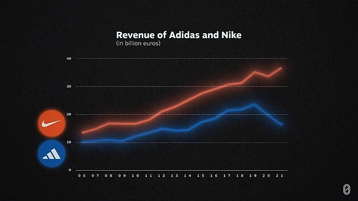 Есть ещё более масштабная картина. За последние 15 лет футбольный рынок был поделен между «Adidas» и «Nike». Он оставался в равновесии, потому что на стороне каждого бренда был один из величайших игроков эпохи: у «Adidas» был Месси, а у «Nike» Роналду.