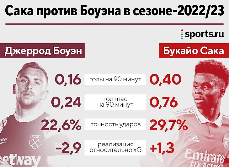 Характерный пример: в сезоне-2021/22 основные статистические показатели Боуэна были практически идентичны результатам вингера «Арсенала» Букайо Сака, имеющего схожие антропометрические параметры. Сака опережал Боуэна по количеству пасов и ударов, что связано с разной стилистикой игры команд, но по числу голов, точности ударов и реализации моментов показатели были почти одинаковыми. В нынешнем сезоне статистические показатели Сака в два и более раза превышают цифры у Боуэна.