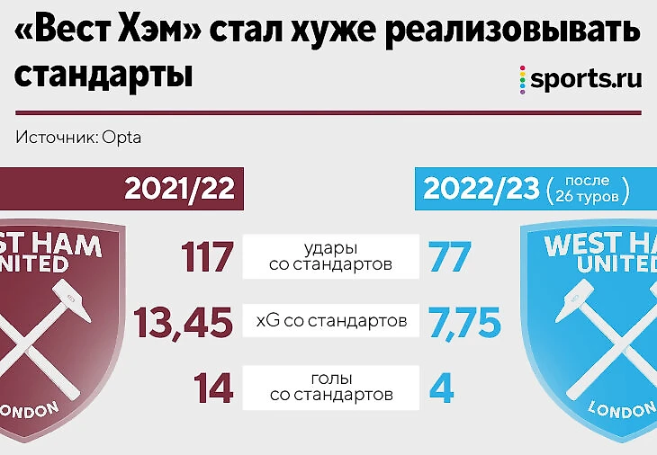 Ситуацию могли бы исправить стандарты – в прошлых сезонах это было грозное оружие «Вест Хэма», который был среди лидеров по числу голов с угловых и после розыгрыша штрафных, а также мячей, забитых головой.