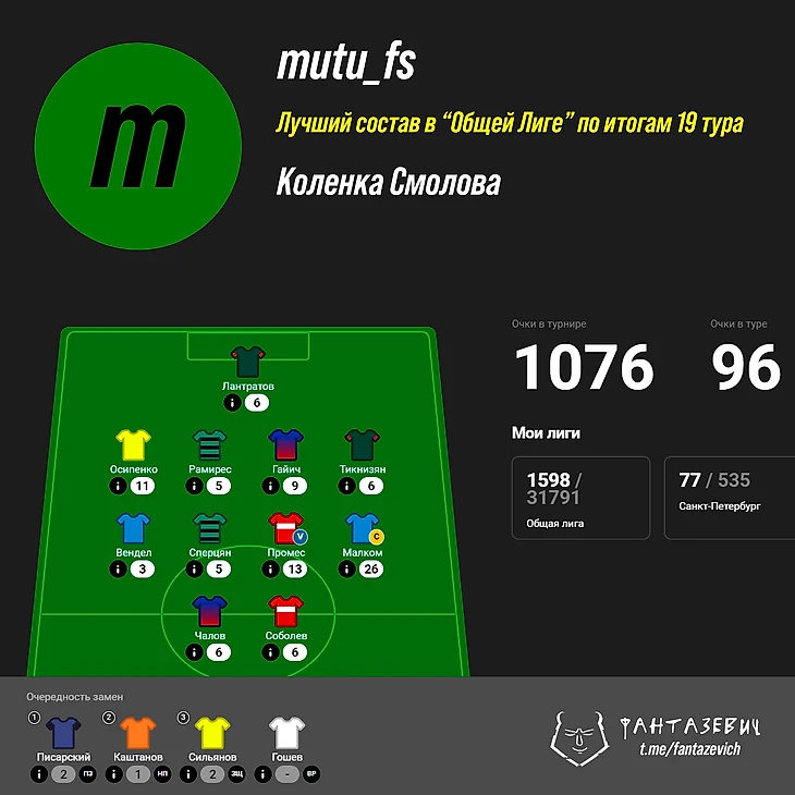 Перед вами команда под названием "Коленка Смолова", которую собрал пользователь mutu_fs. Итог более, чем солидный - 96 ФО.