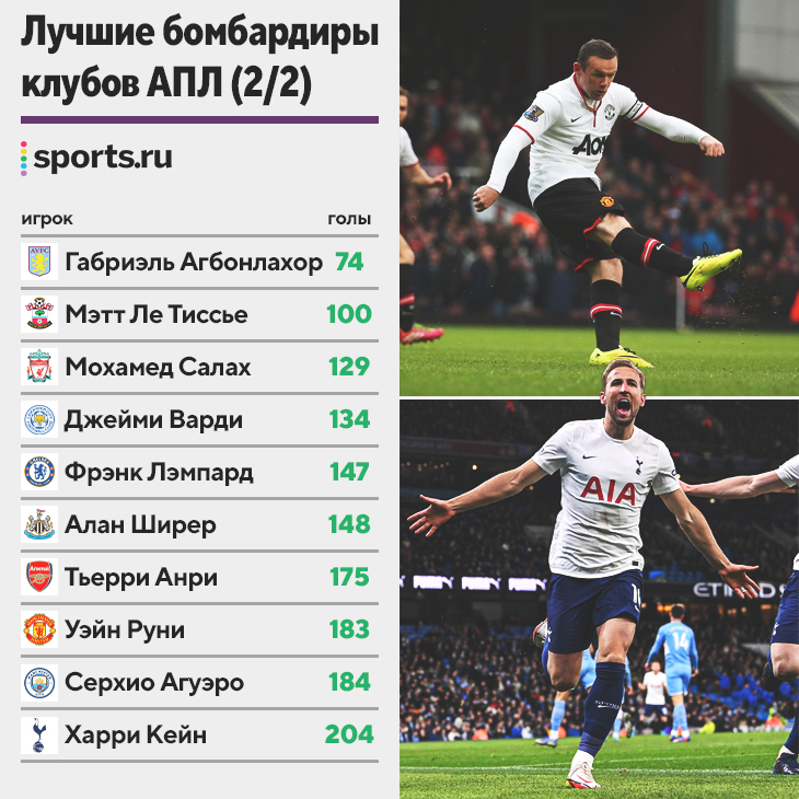• Кейн − лучший бомбардир АПЛ, если брать только голы за один клуб (хотя у Харри были еще 3 матча за «Норвич»). Но в общем топе он третий − впереди Уэйн Руни (208) и Алан Ширер (260).