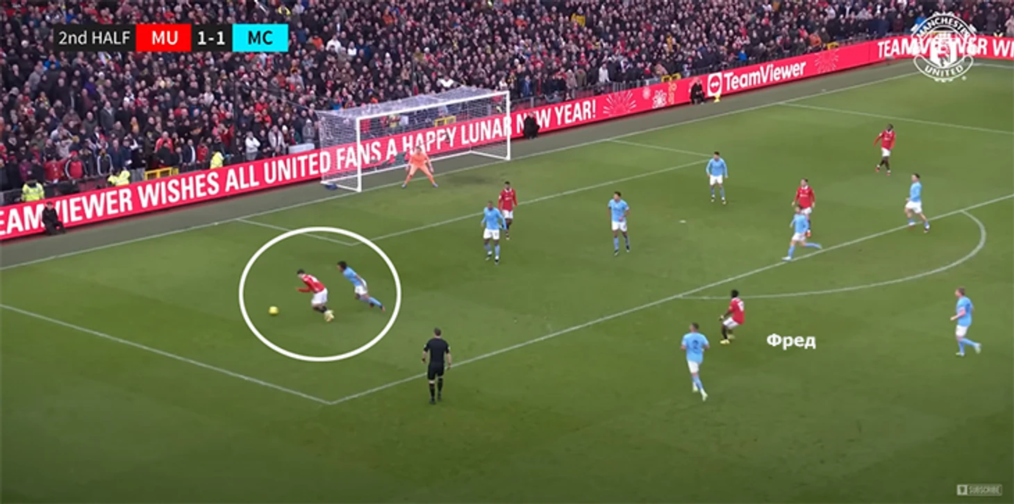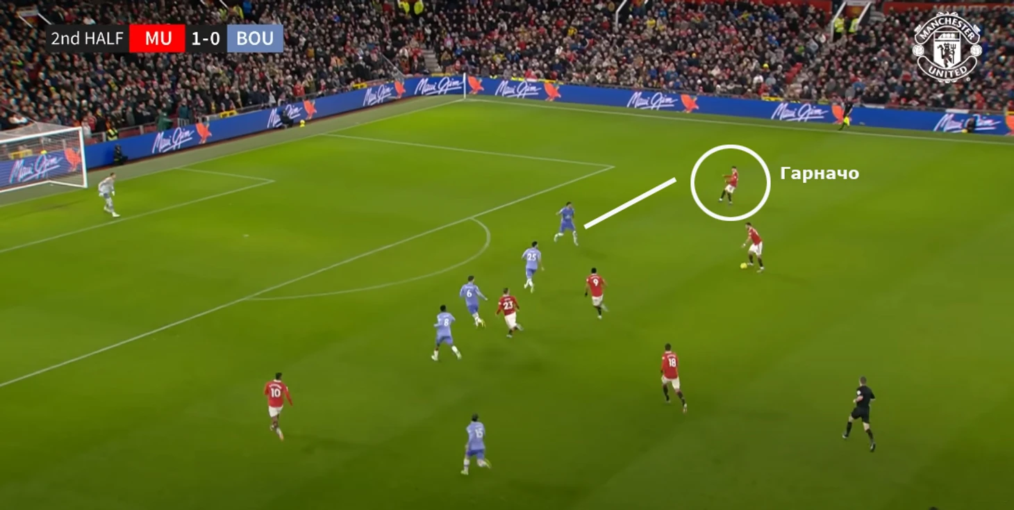 Гарначо протискивается за счет техники, толкается за счет хорошей физики. Если выходит – «МЮ» почти гарантированно получает опасный момент.