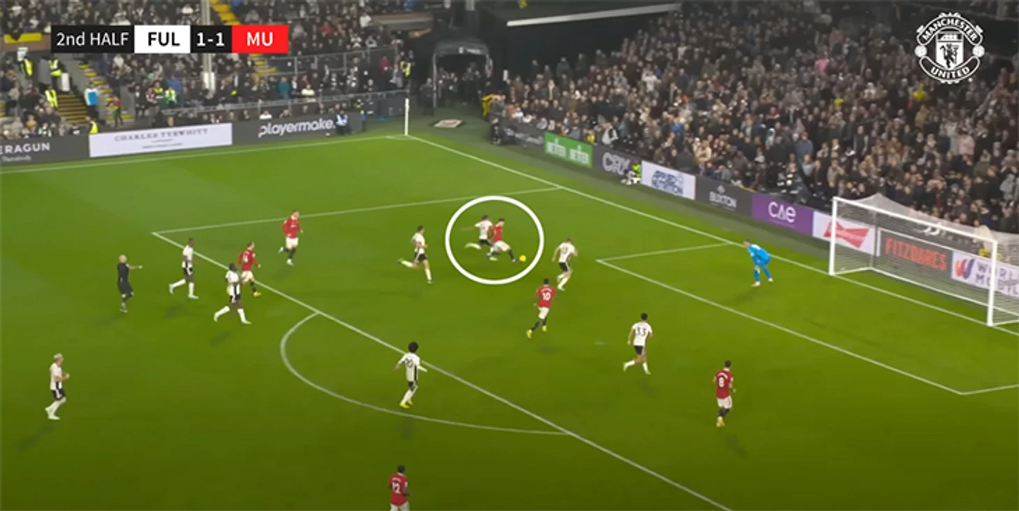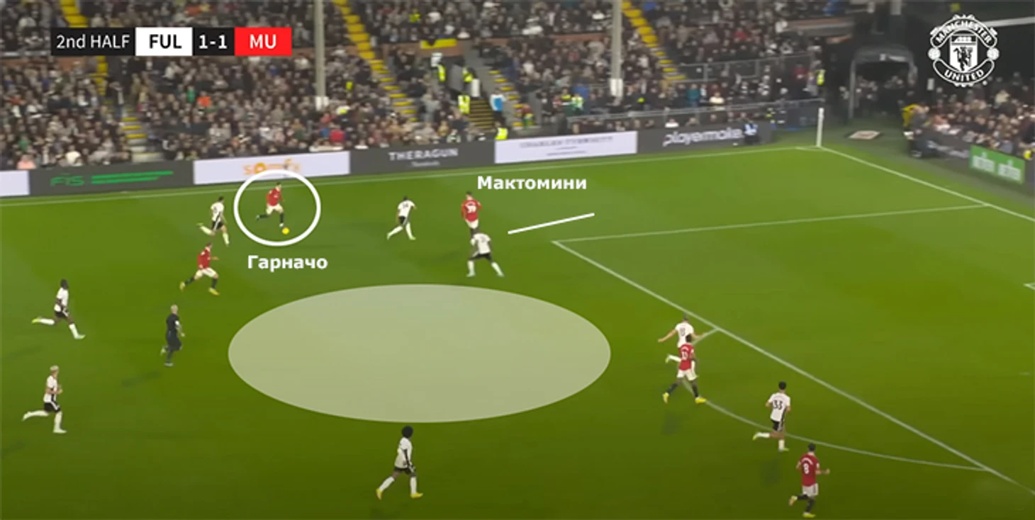 Еще Алехандро любит начинать движение, открываясь максимально широко. Типичная атака «МЮ» с Гарначо: против «Фулхэма» он начинает движение прямо возле боковой линии.